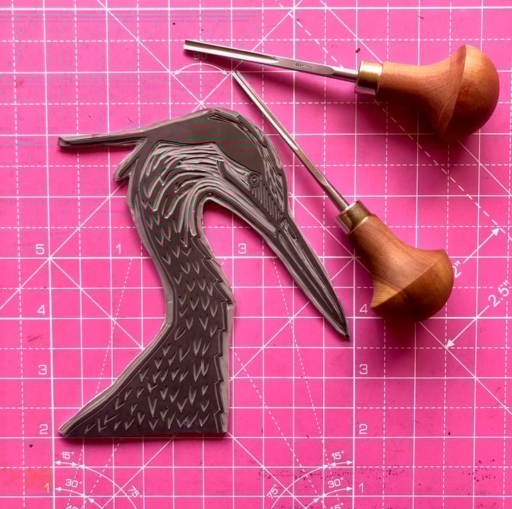 A handprinted linocut design greeting card featuring the profile of a heron, printed in grey ink. The card is blank inside for your own message.