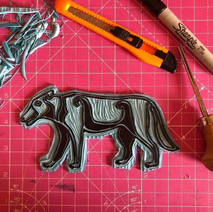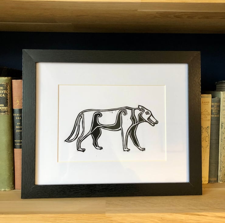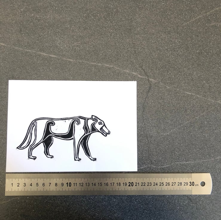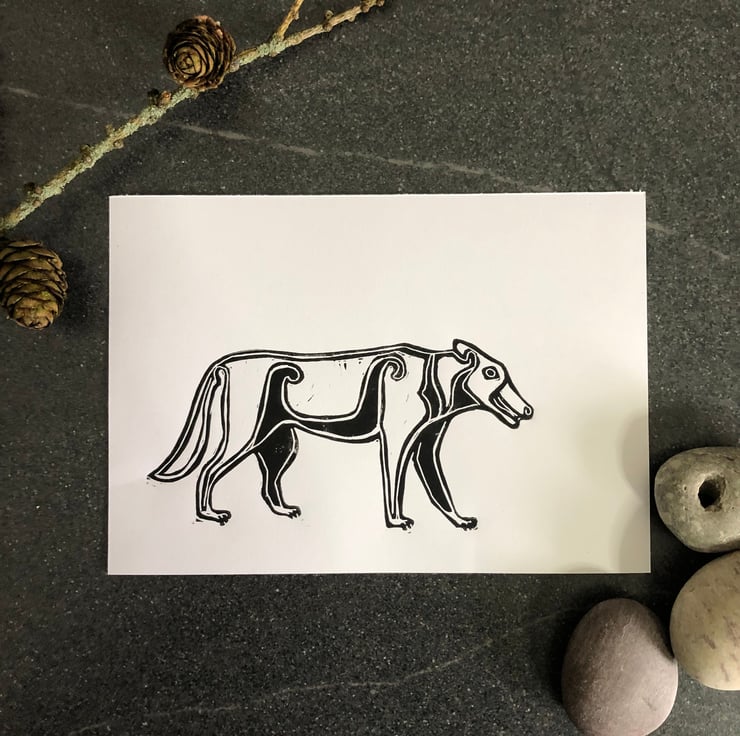 A handprinted linocut design featuring a depiction of The Pictish Wolf. This design is closely based on the figure of a wolf found carved into stone in Ardross, Scotland, that dates to the time of the Picts.