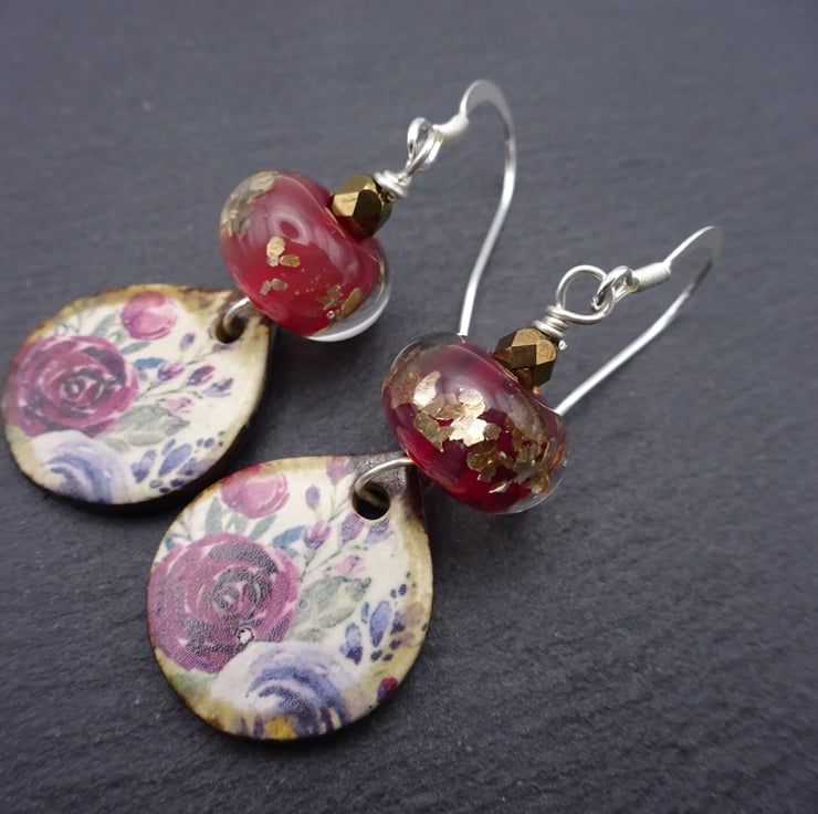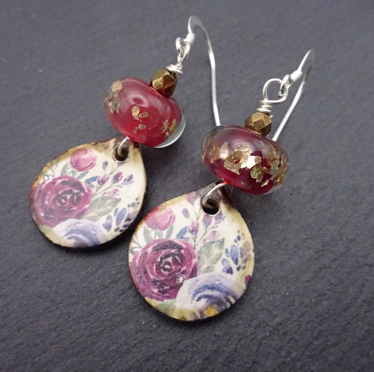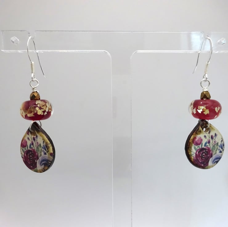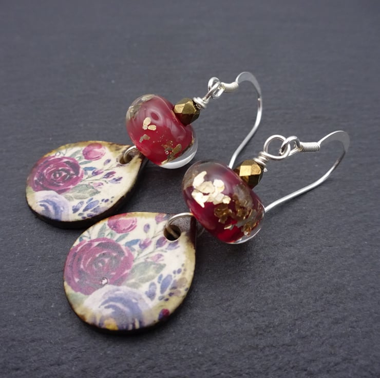 A pair of earrings made with sterling silver ear wires, handmade lampwork glass beads and handmade ceramic rose drops.