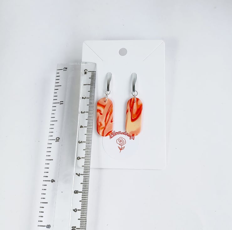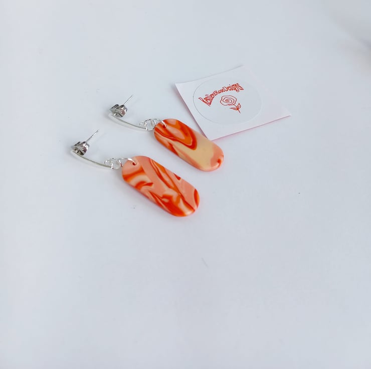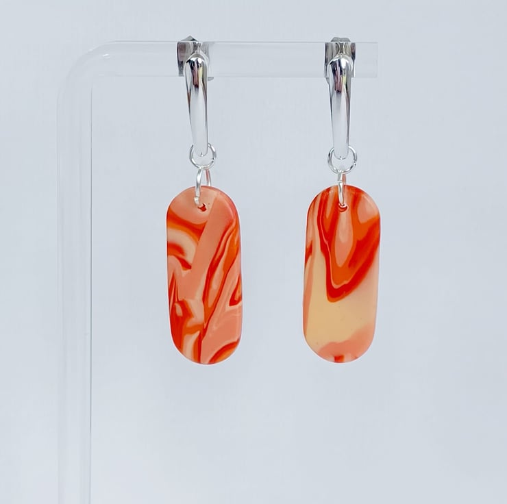 These unique oblong orange marble effect dangle earrings were handmade from a special blend of polymer clay. They come with stainless steel studs. These earrings are one of a kind and are ready to post.