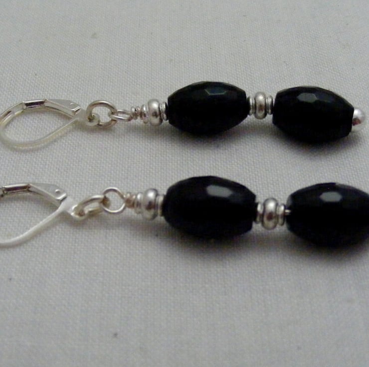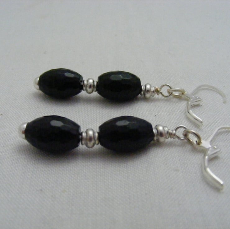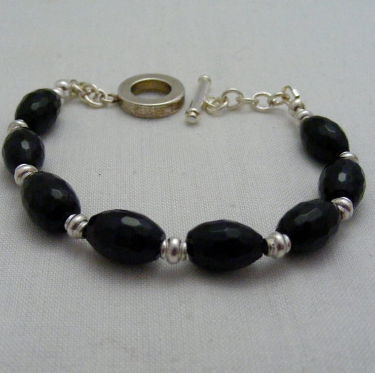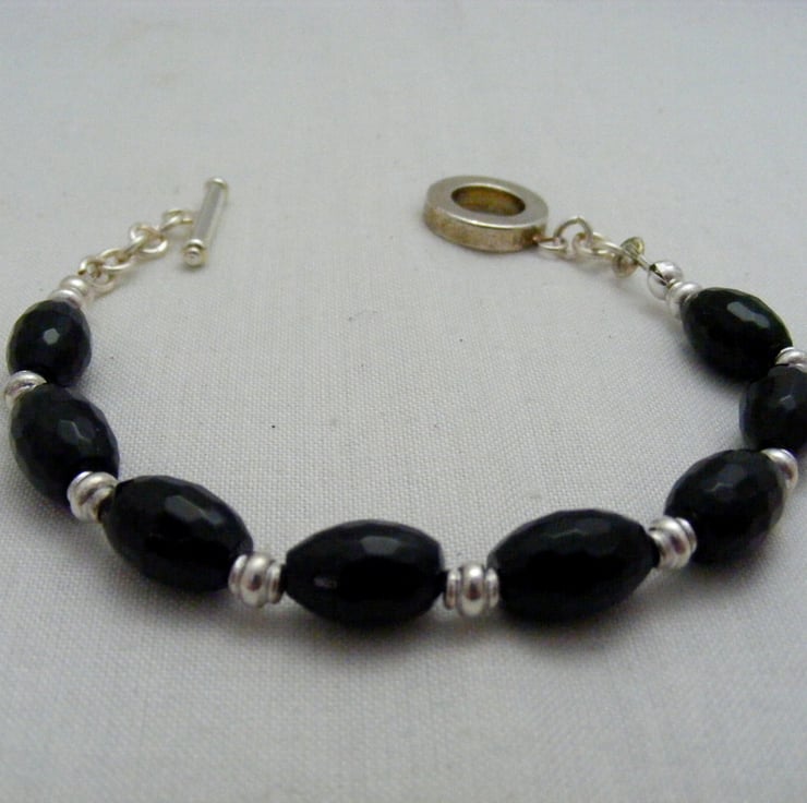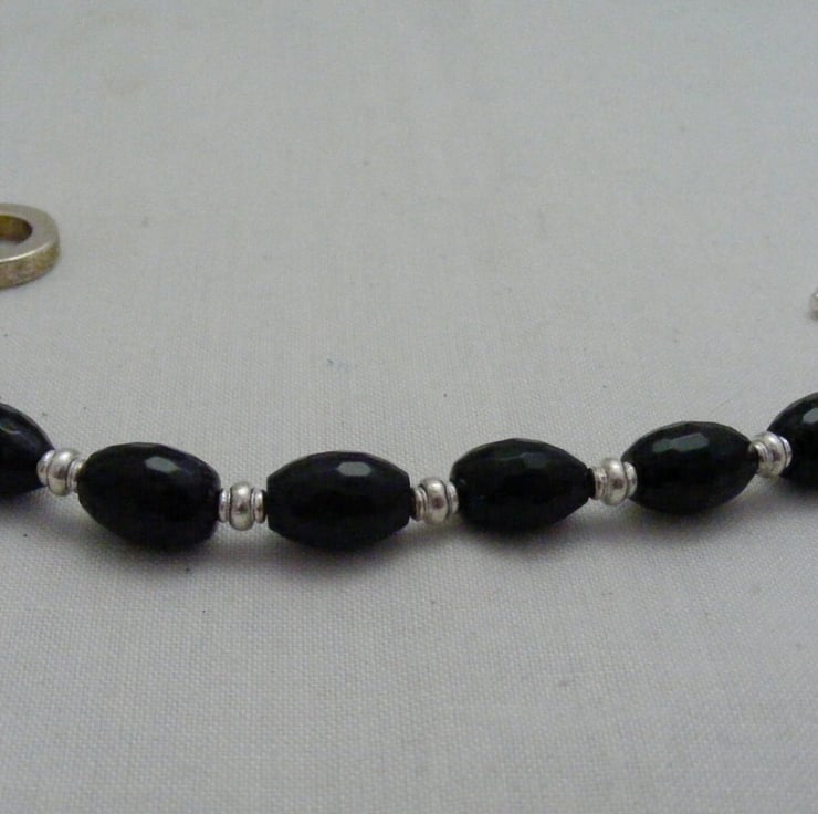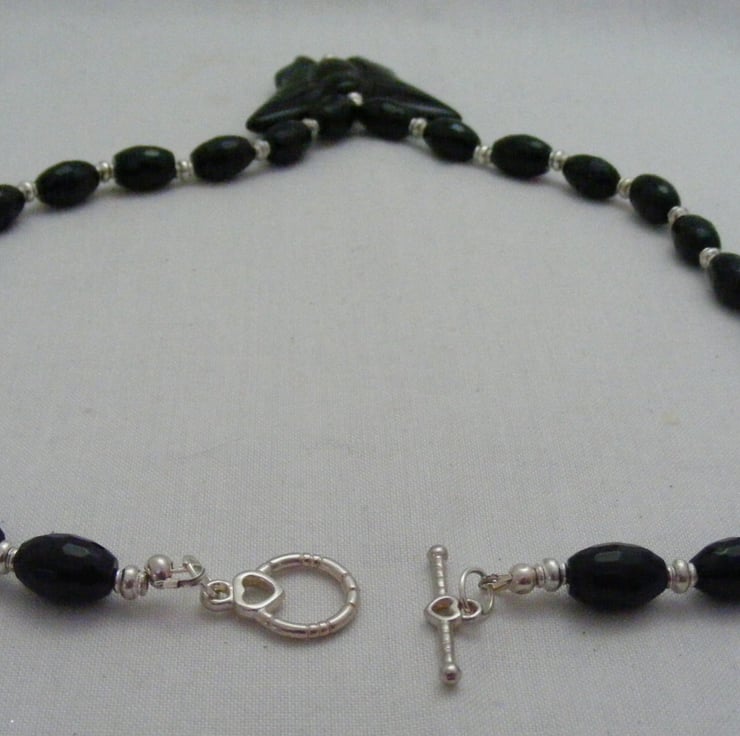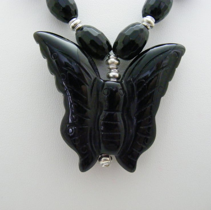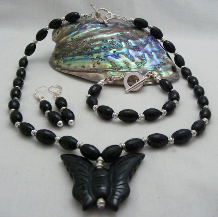 Gemstone jewellery set consists of a necklace, bracelet and earrings. I've handmade this lovely set using, 46x40mm black agate butterfly pendant, 11x8mm black faceted onyx rice beads, 4x2mm silver plated spacers, silver plated findings and beading wire. Necklace and bracelet both have silver plated toggle clasps and earrings have silver plated lever backs.