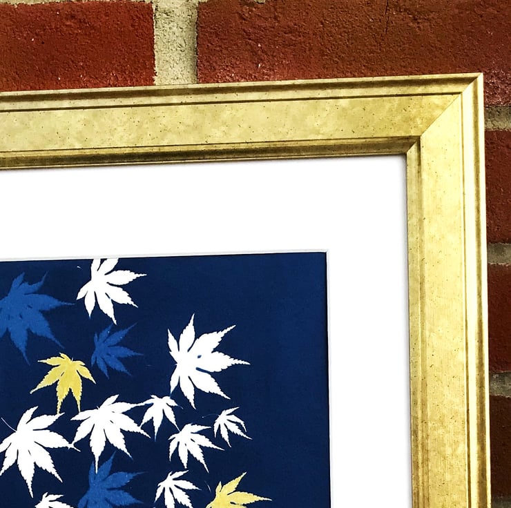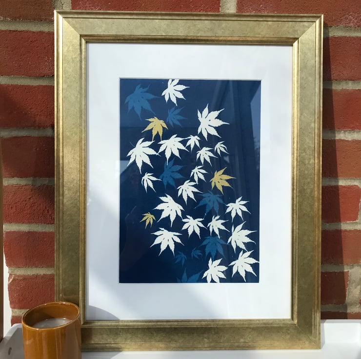 Original framed artwork- Japanese maple leaves (Acer Palmatum) adorn this Traditional Cyanotype, some of which I have embellished with gold ink.