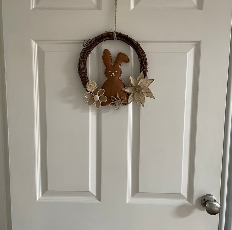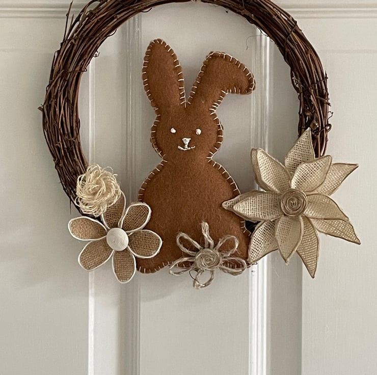 Hand stitched and embroidered felt bunny as the center piece. With braided jute flowers which add depth and texture to this hanging decoration.