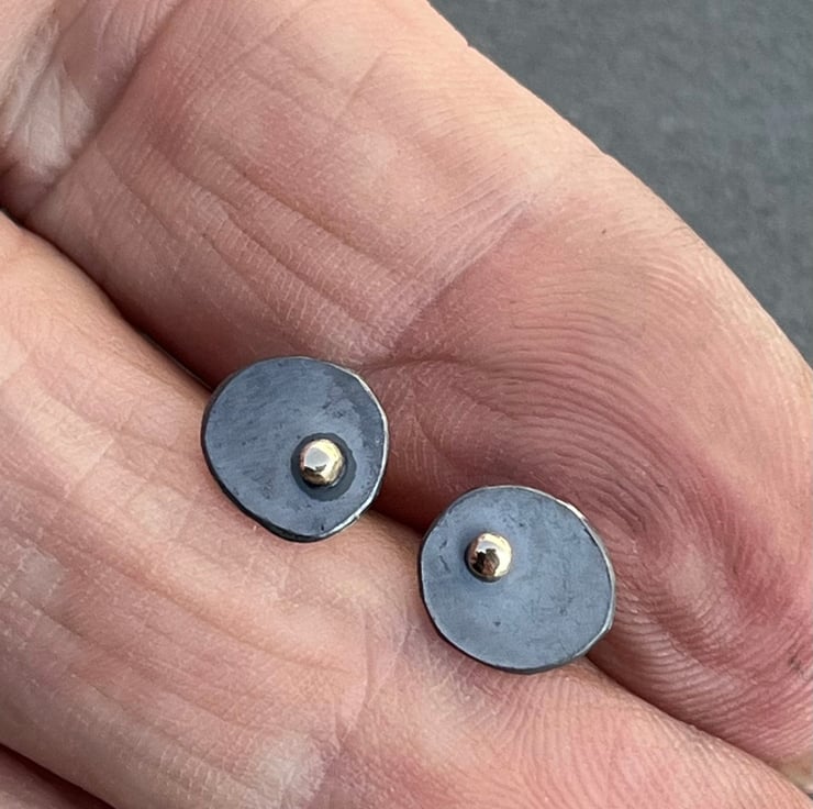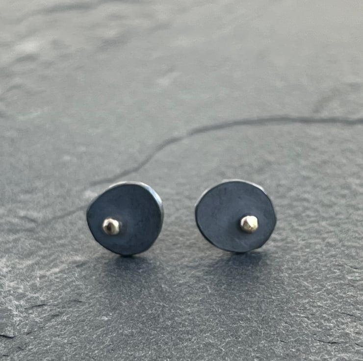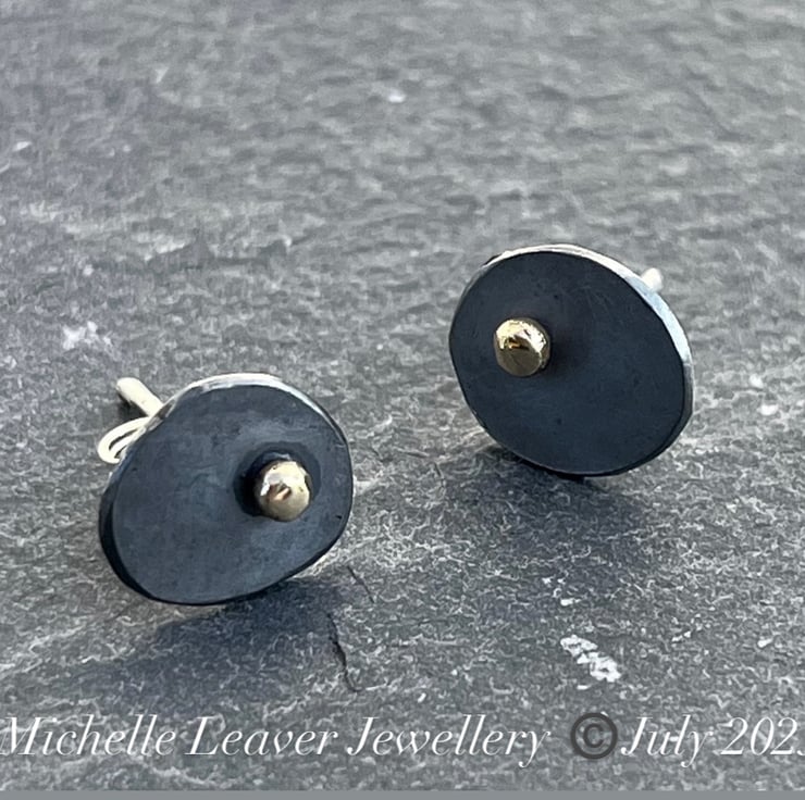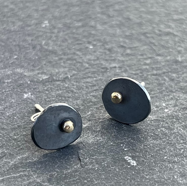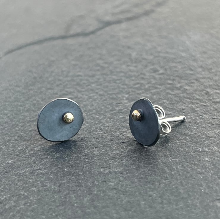 These Gold Dot Studs are oxidised which contrasts beautifully with the 9ct yellow gold dots. The backs are shiny and the posts and butterfly backs are also Sterling silver.