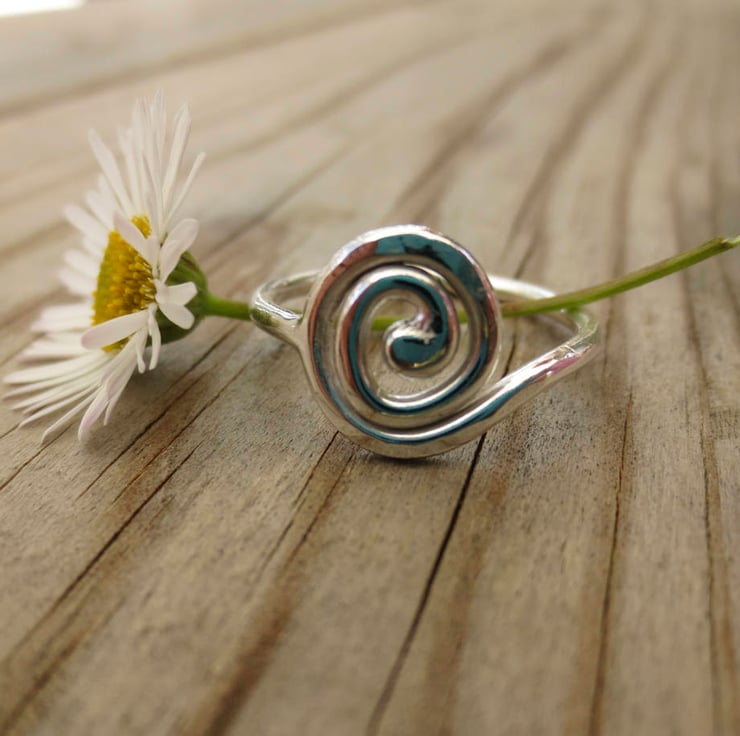 Solid sterling silver hand made spiral ring. The spiral of the ring measures approximately 1cm, and is gently hammered for plenty of sparkle. The ring is constructed in one piece, from 1.5mm wire