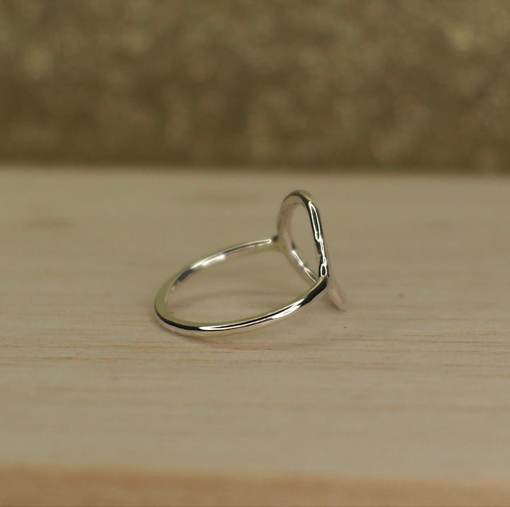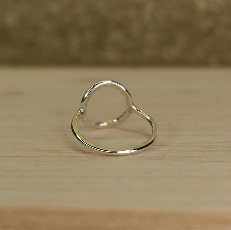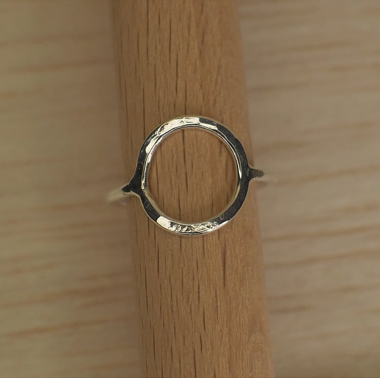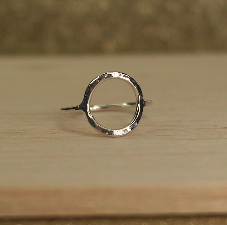 Sterling silver handmade circle ring. The wire of the ring is 1.5mm wide.The circle measures 12mm across and has a lightly textured, hammer finish.. The circle is gently shaped to match the curve of the ring making it extra comfortable for daily wear.