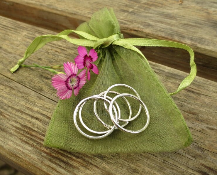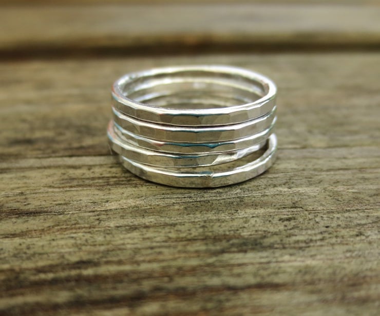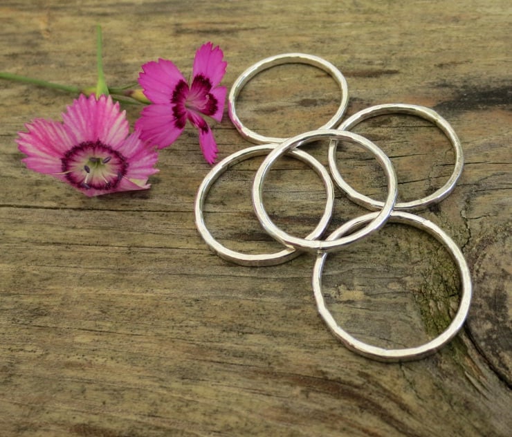 Set of Five Solid Sterling Silverstacking rings. These are each handmade from recycled 1.5 mm sterling silver wire before being polished. The rings have a hammered finish giving them texture and a bit of sparkle.