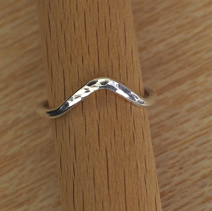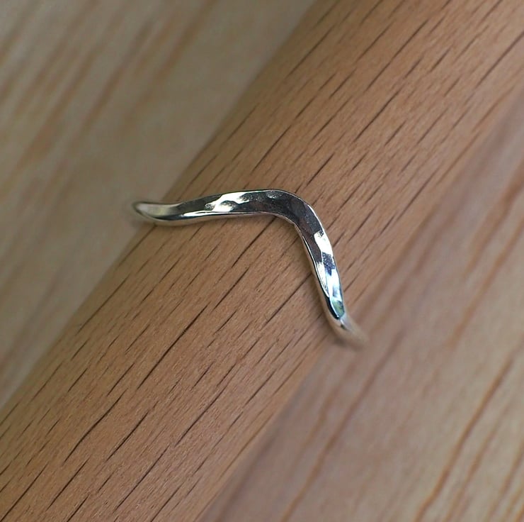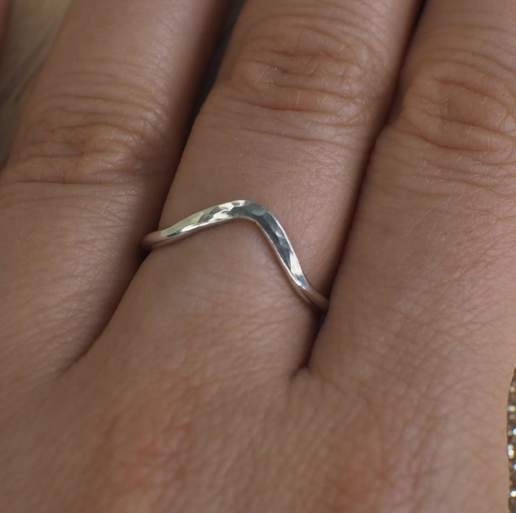 Solid sterling silver hand made wishbone / shaped curved ring. The band of this ring is 1.5mm wide. The wishbone shape is gentrly hammered flat and measures approximately 1 cm across.