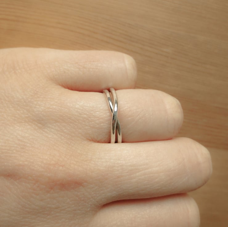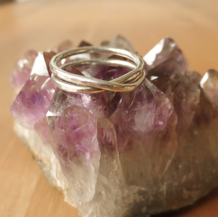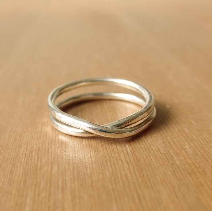 Solid sterling silver, handmade crossover ring. The ring is made from a continuous loop of 1.5mm wire, giving a total width of approximately 3mm. The surface is lightly hammered to give a textured sparkly finish.