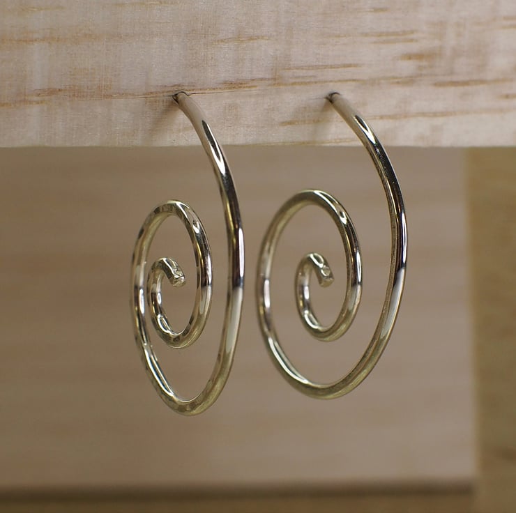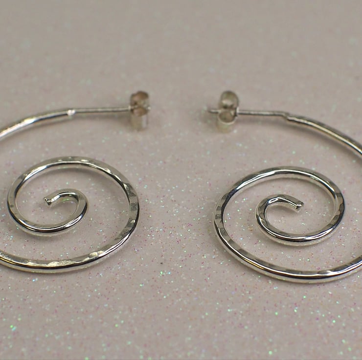 These are handmade from 1.5 mm recycled silver wire, and have a highly polished hammered finish. The width and height of the spiral measure approximately 25mm