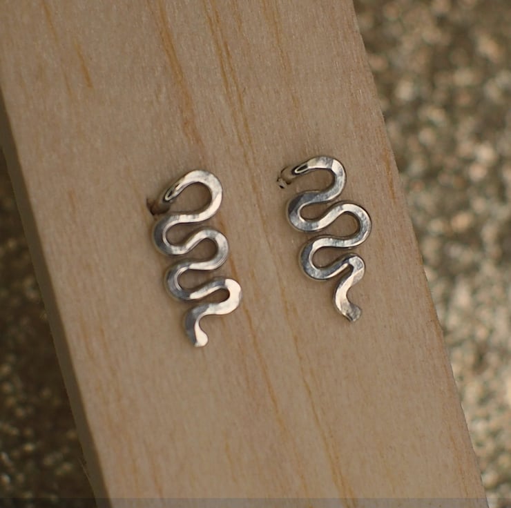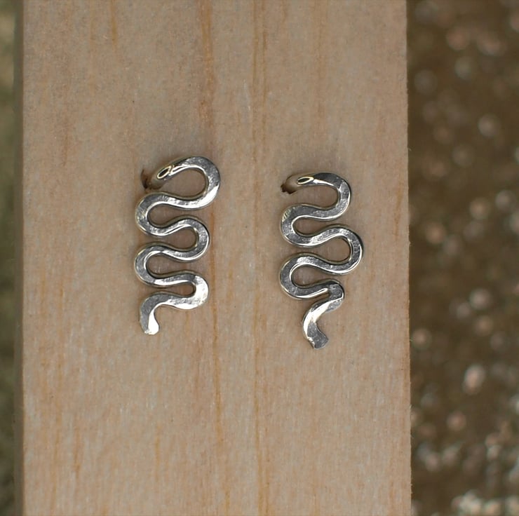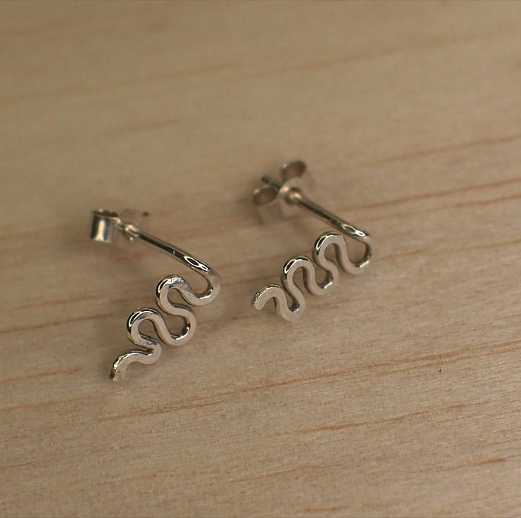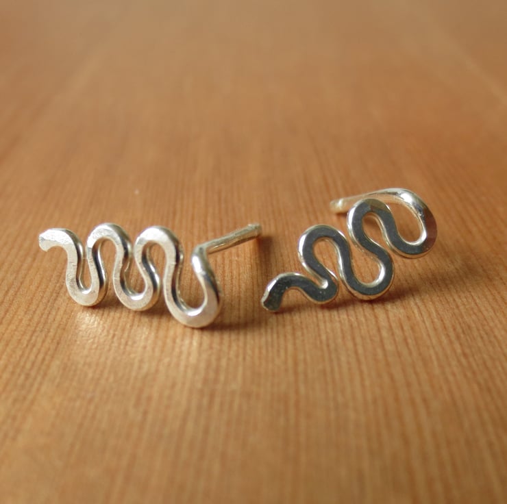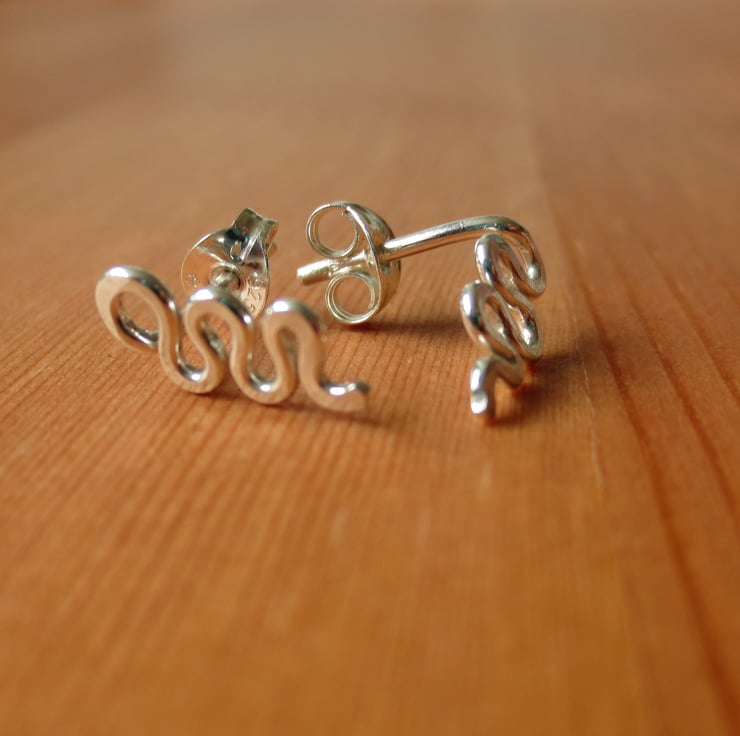 A pair of solid sterling silver 'snake' stud earrings. These are made from 1mm sterling silver wire which is hand rolled and shaped into a stylised snake design.