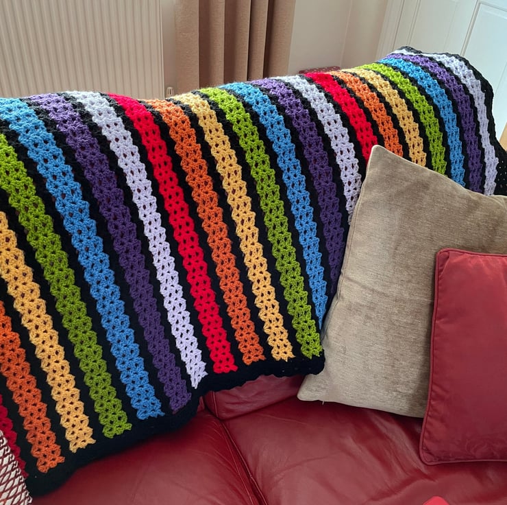 Beautiful bright coloured blanket. Worked in stripes with each colour of the rainbow, with a black section in between each colour.