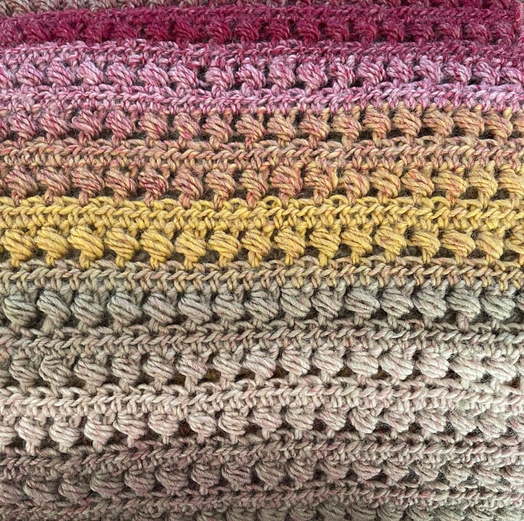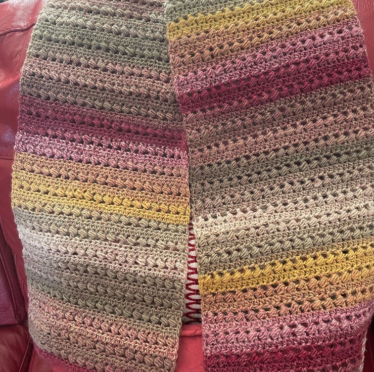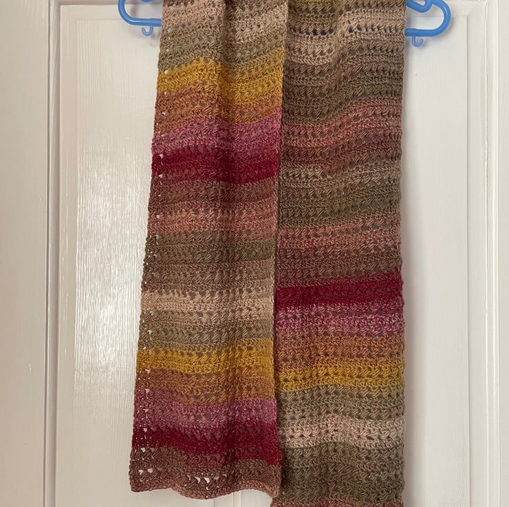 Beautiful Scarf crocheted in Bead stitch. Crocheted using a variegated yarn, with berry, pinks, mustard and beige and colours in between these. The scarf would be ideal for a male or female.
