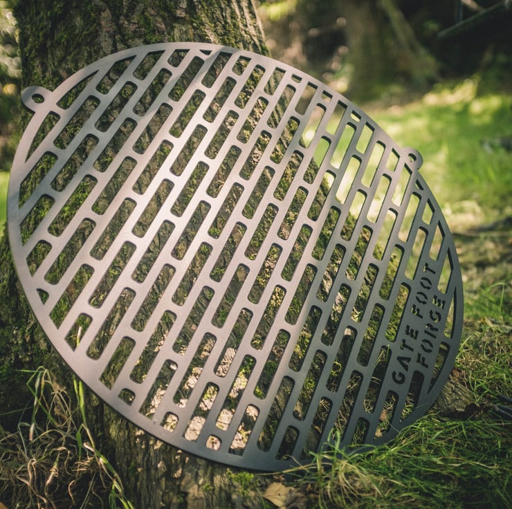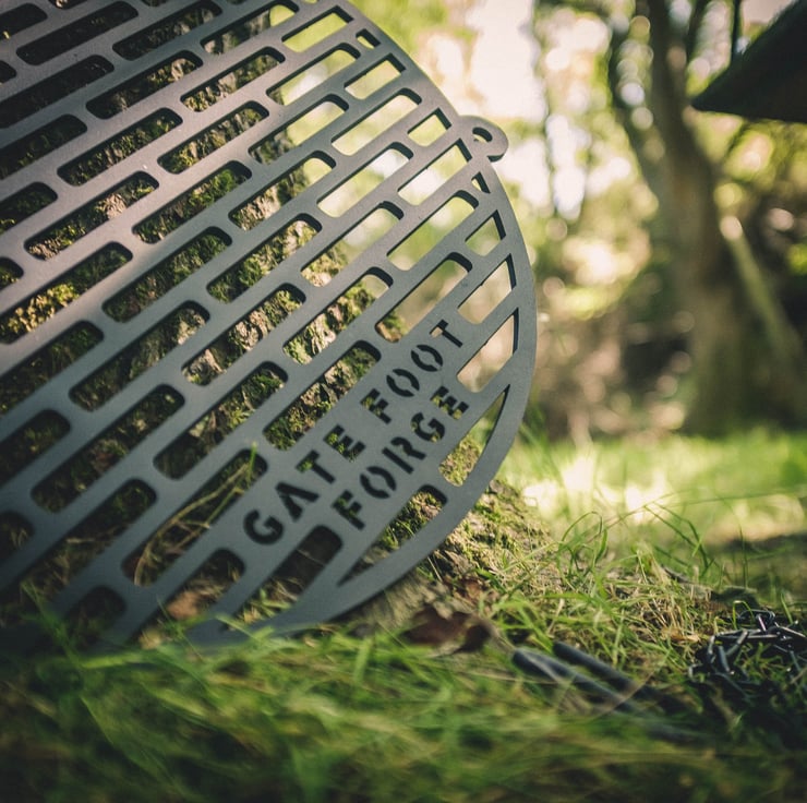The standard round hanging grill is 50cm across and is sized to fit my standard 1m tripod. The grill is precision-cut from 6mm steel and is supplied with a set of 60cm long chains, linked into a forged ring, with three hand-forged hooks S hooks which allow it to be suspended. The height can be adjusted by hooking the grill into different links on the chains.