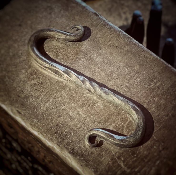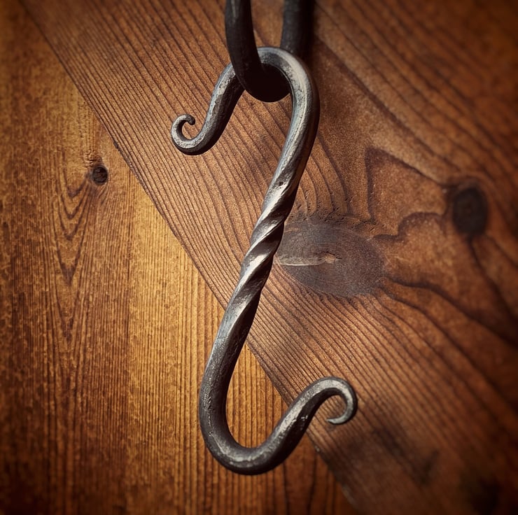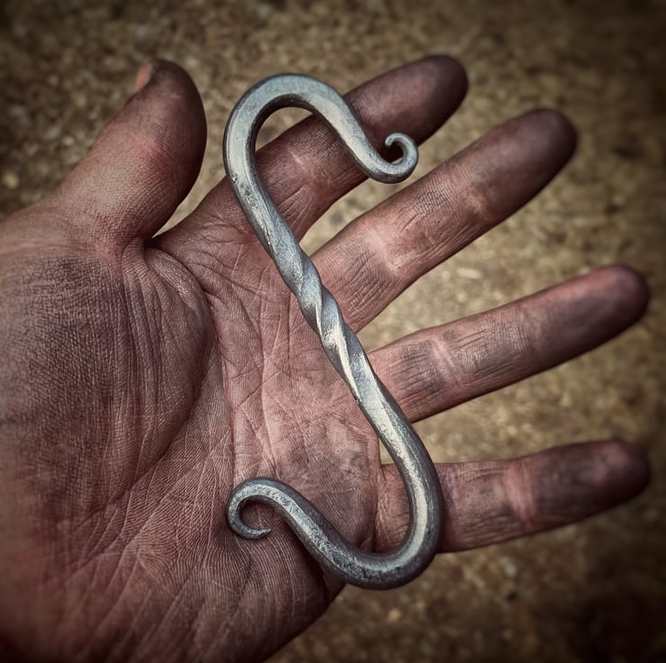 Forged from 8mm mild steel stock, they are roughly 140mm long, and feature scrolled ends and a neat little twist in the middle. They are perfect for hanging things off other things...!