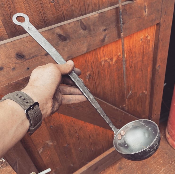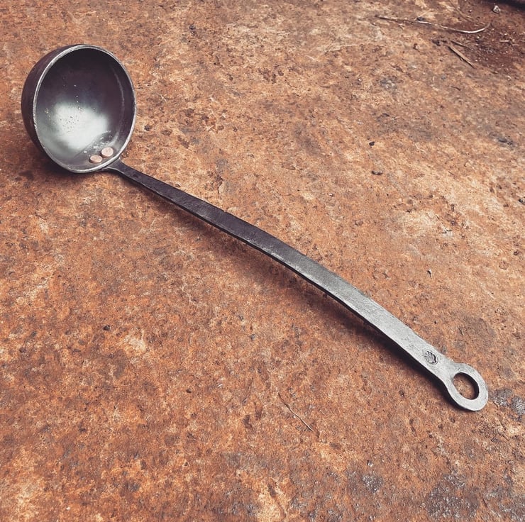 This beautiful and unique hand forged ladle is ideal for outdoor or indoor cooking. The 35 cm handle lets you get right to the bottom of big pots and it incorporates a good sized hole in the end for easy hanging.