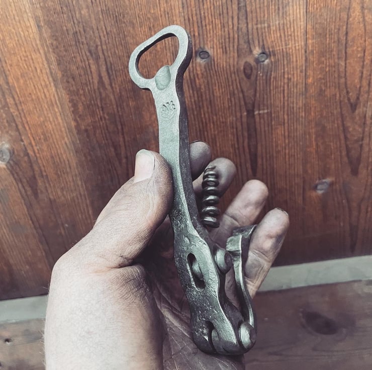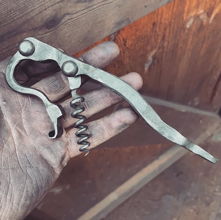 Based on the traditional "waiter's friend", this hand-crafted corkscrew used mechanical advantage to lever the cork easily from the bottle. It also features a bottle opener on the handle end. A very satisfying tool with two riveted linkages, ideal for the discerning wine-drinker. It's not cheap, but it takes me about three hours to make one of these! The handle and lever are forged from mild steel and the corkscrew itself is from spring steel recycled from old car coil springs!