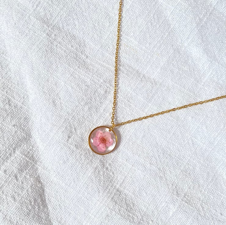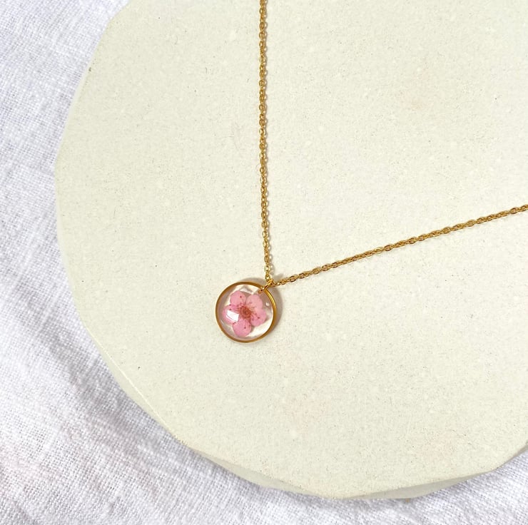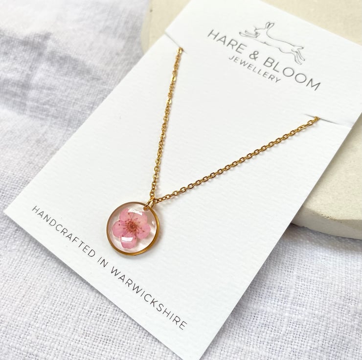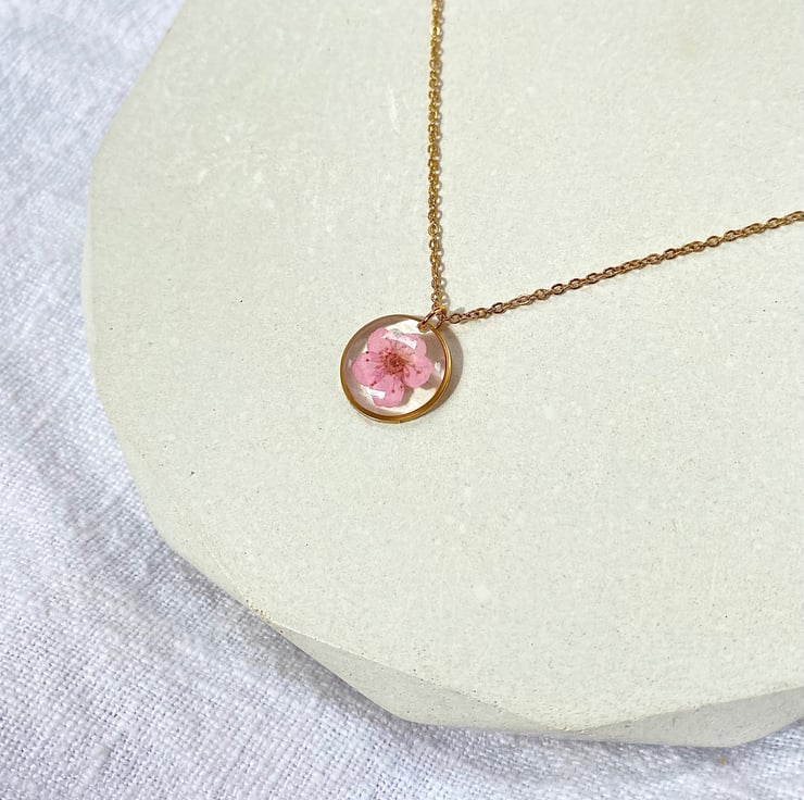 This dainty necklace features a real pressed pink blossom flower set within clear epoxy resin and framed in a gold stainless steel pendant.