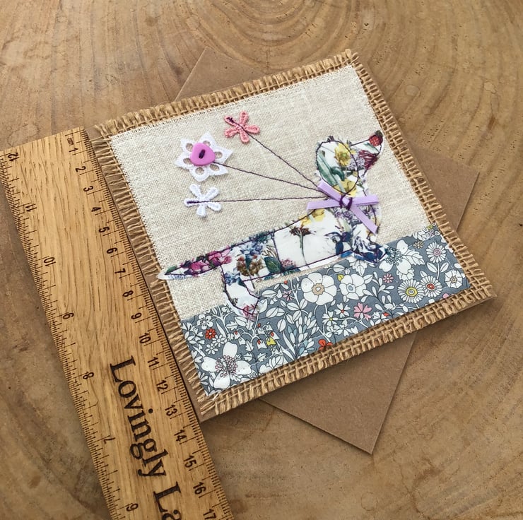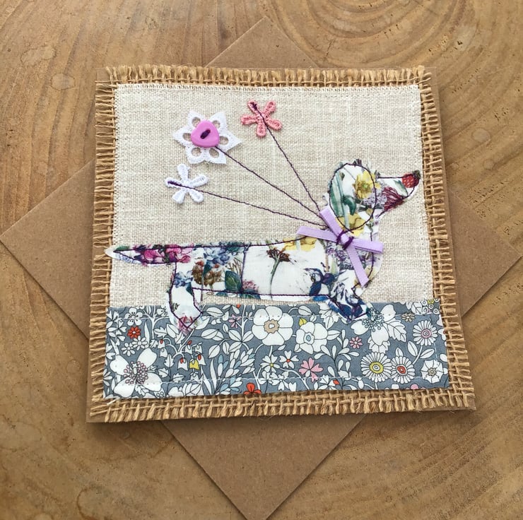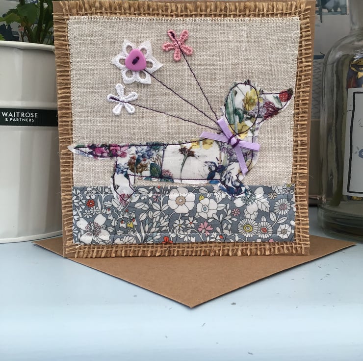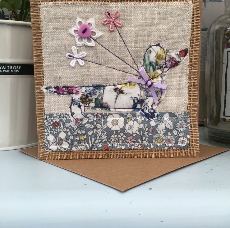 Handmade using a Laura Ashley and hessian fabric background to free motion stitch and appliqué this very lovely liberty fabric dachshund carrying flowers to the lucky recipient.