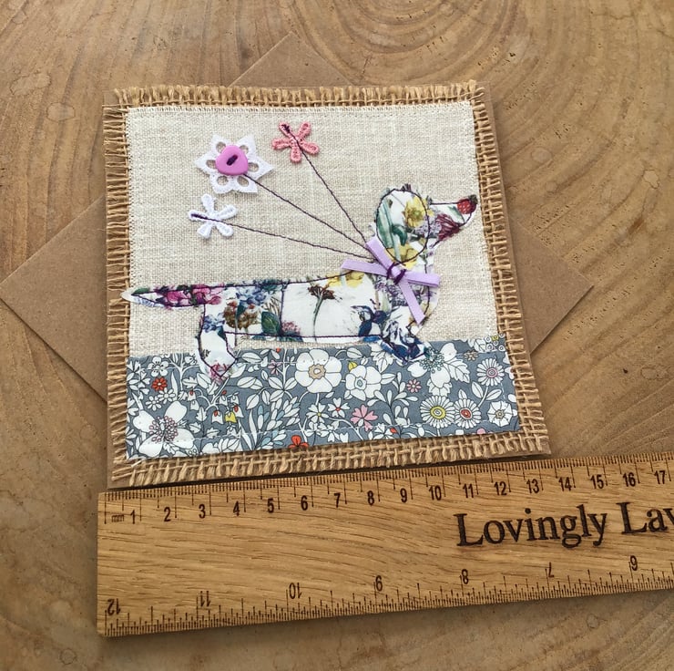 Hi there, this exceptionally cute dachshund card is just perfect for a dachshund lover, this stitched liberty fabric card is blank inside and can be used for any suitable occasion, it comes with a matching recycled envelope.