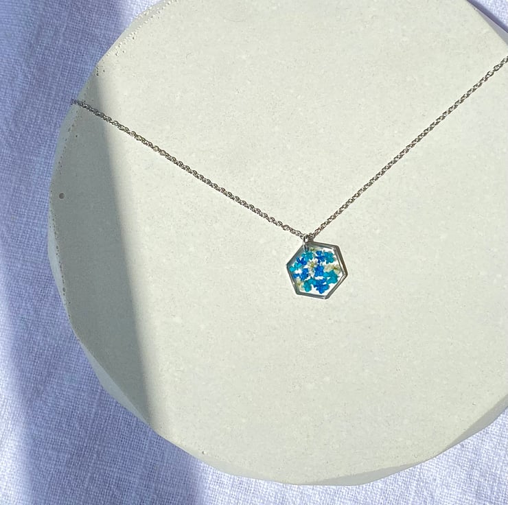 This handcrafted necklace features mixed blue and and white Queen Anne’s Lace flowers set within clear epoxy resin and framed in a silver stainless steel pendant.