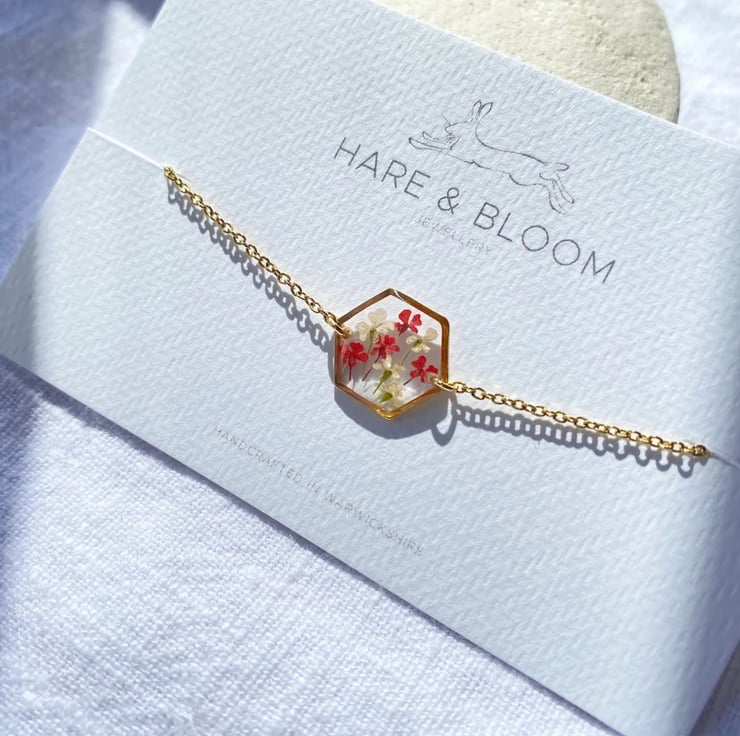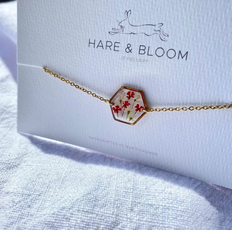 All of our botanical jewellery is handcrafted with real, naturally pressed flowers and leaves, making each piece completely unique. This does mean that there may be some minor variations in flower shape and colour.