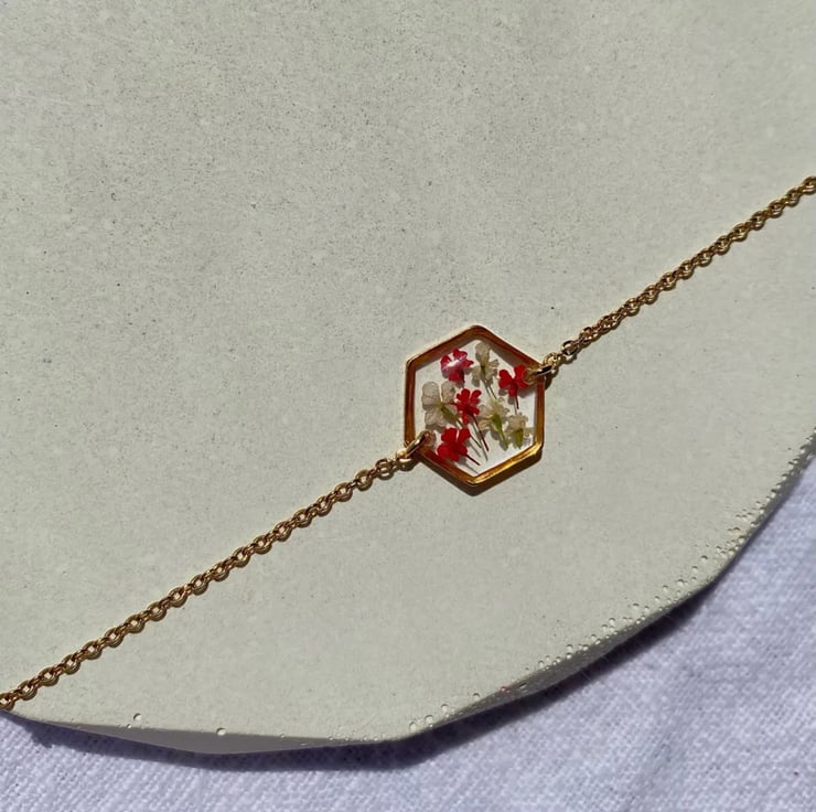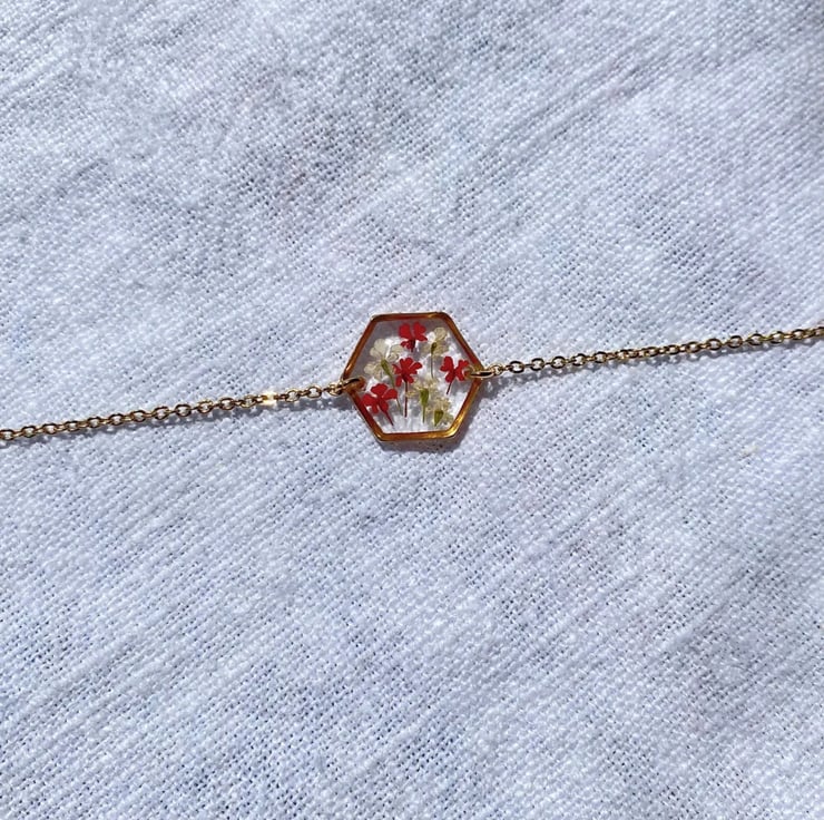 This handcrafted bracelet features red and white Queen Anne’s Lace flowers set within clear epoxy resin and framed in a gold stainless steel pendant.