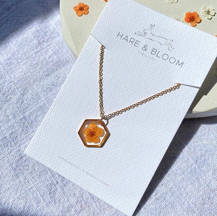 This handcrafted necklace features a pressed orange blossom flower set within clear epoxy resin and framed in a gold stainless steel pendant.