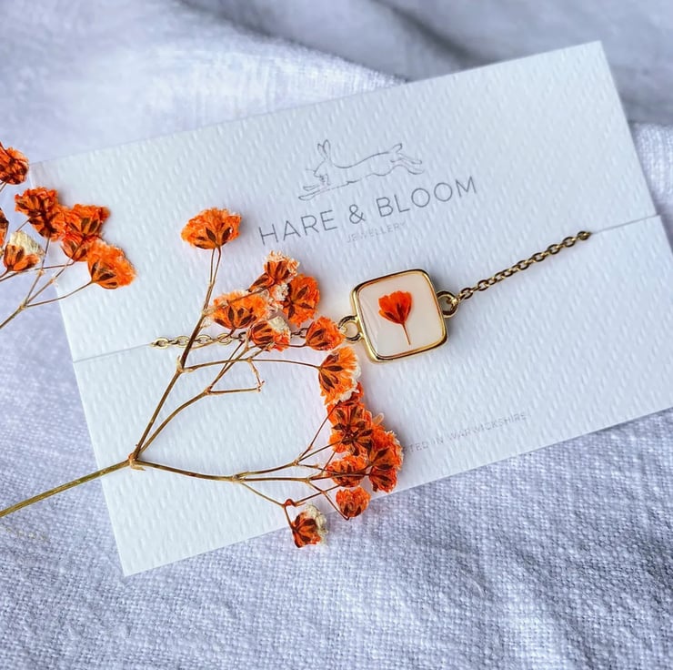 All of our botanical jewellery is handcrafted with real, naturally pressed flowers and leaves, making each piece completely unique. This does mean that there may be some minor variations in flower shape and colour.