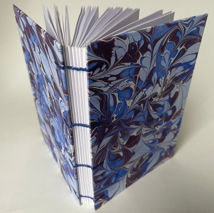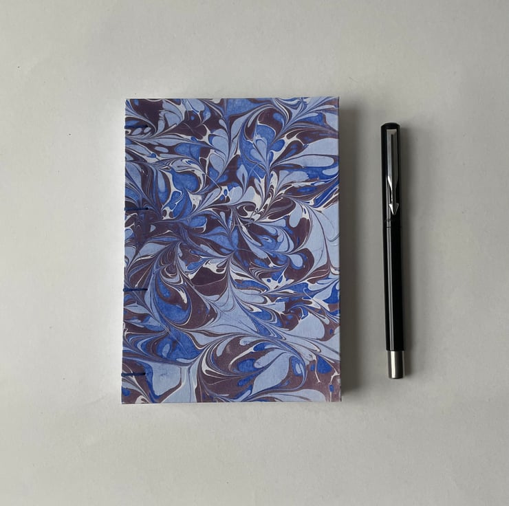 Each sheet of my hand marbled paper is a one-off. For this pattern I have used gouache paints on a traditional bath of carrageenan seaweed, mixing the paints to create my own colour palette. Using lightly waxed blue thread and the ancient bookbinding skill of Coptic stitching, which leaves the spine exposed, this book lies flat when open. Carefully made by hand with quality workmanship at the core, each book is measured, cut, folded, glued and stitched by me in my studio and is completely unique. Due to its handmade nature the pattern may have tiny variations or imperfections; this adds charm and character to every piece I create.