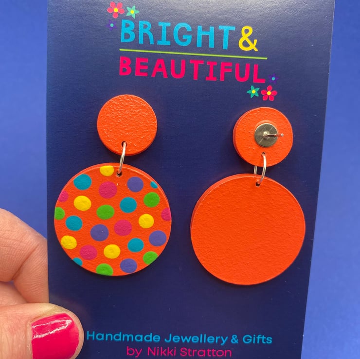 They are made using 3mm thick MDF laser cut shapes which are hand painted in bright, bold designs. Once decorated, they are sealed with several coats of varnish. I use surgical steel stud posts and butterfly fastenings, so they are perfect for sensitive ears.