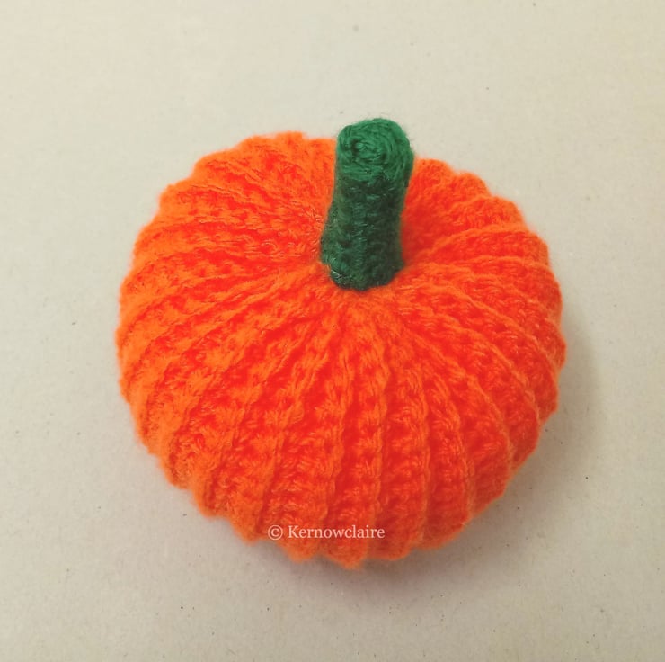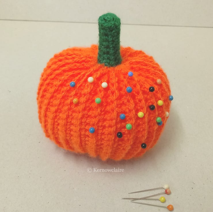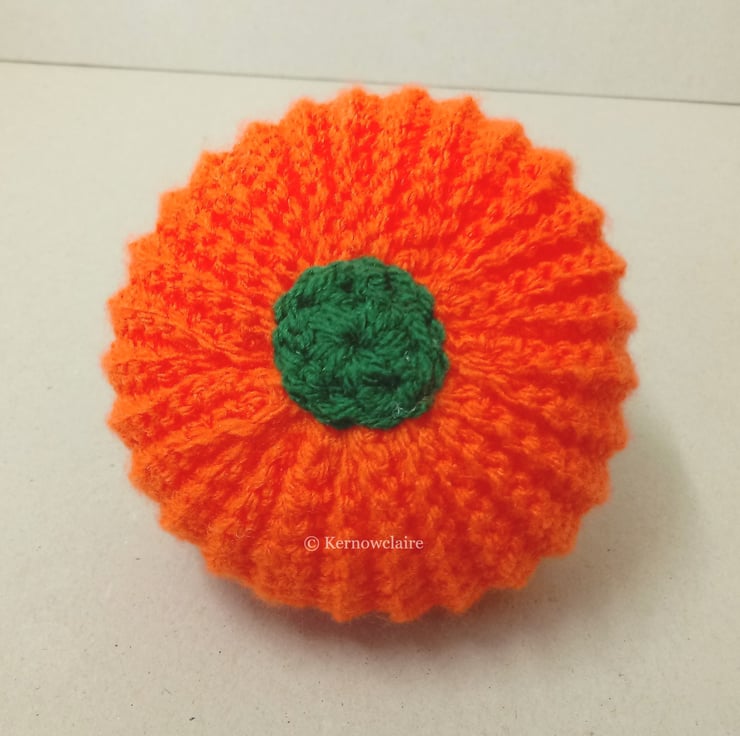 This is a lovely pumpkin pin cushion in bright orange with a green stalk and bottom.