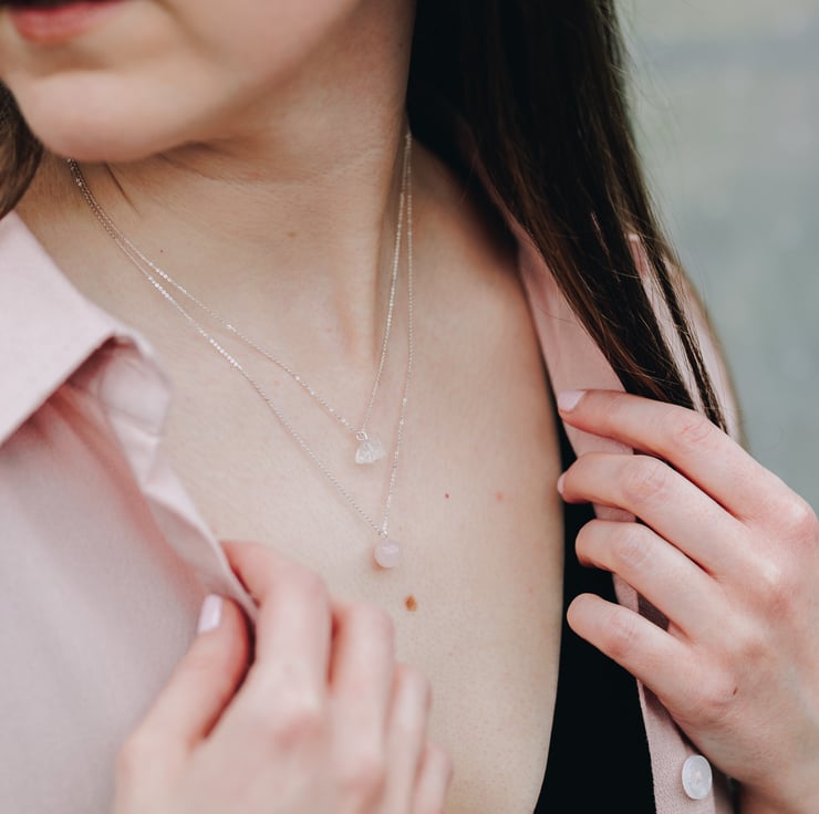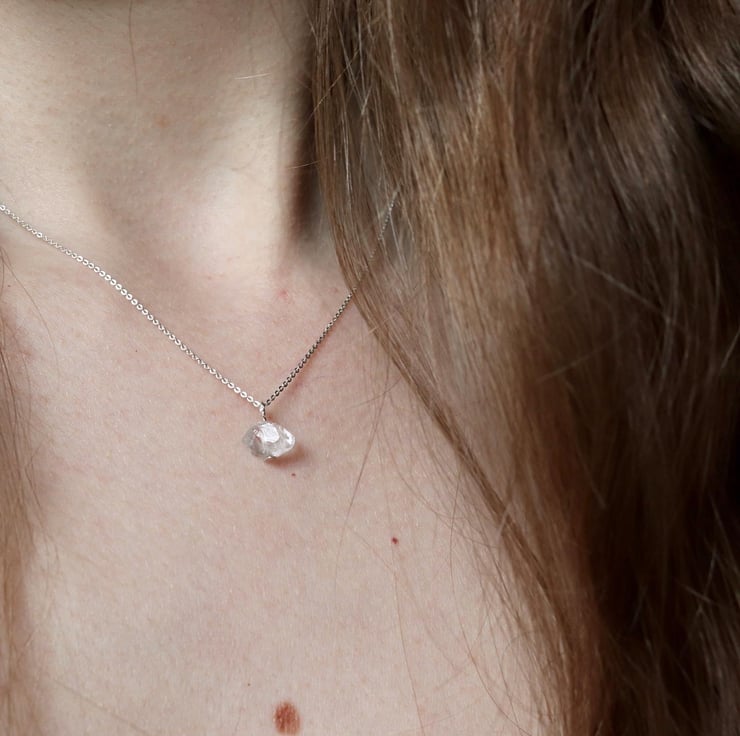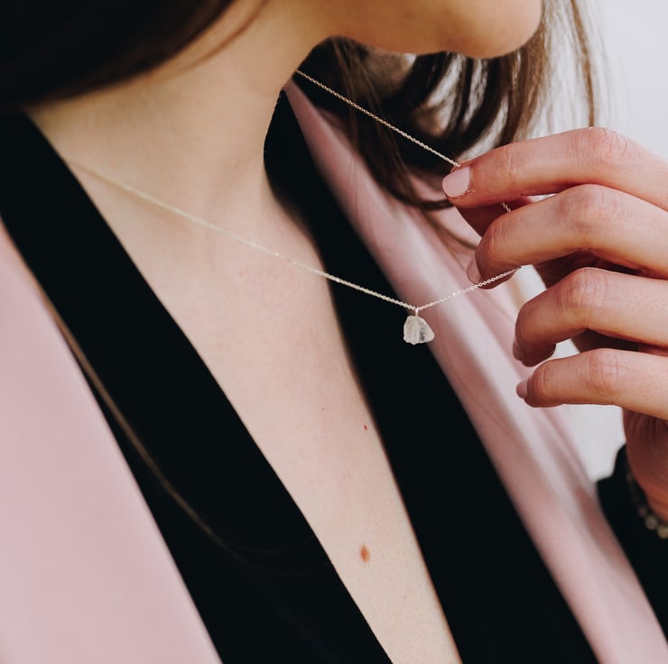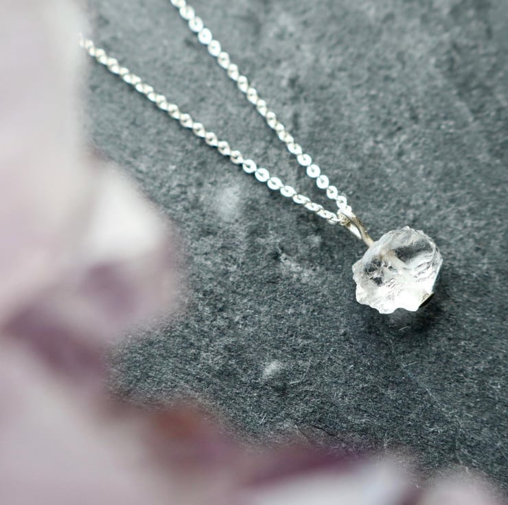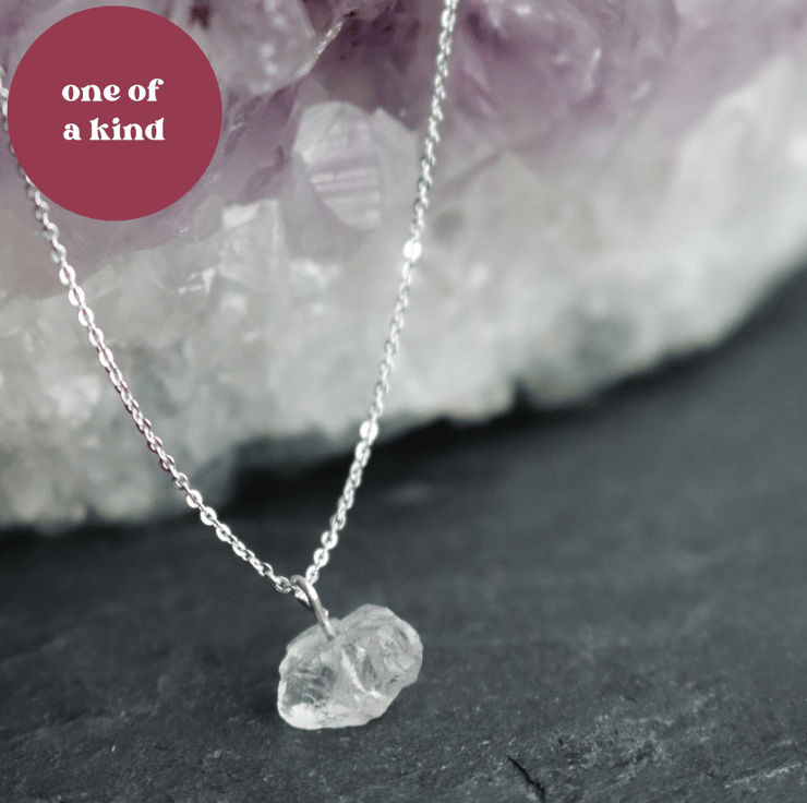 Delicate sterling silver necklace featuring a beautiful raw, unpolished Clear Quartz crystal. All crystals used in my collections are genuine, of high quality, and are ethically and sustainably sourced.