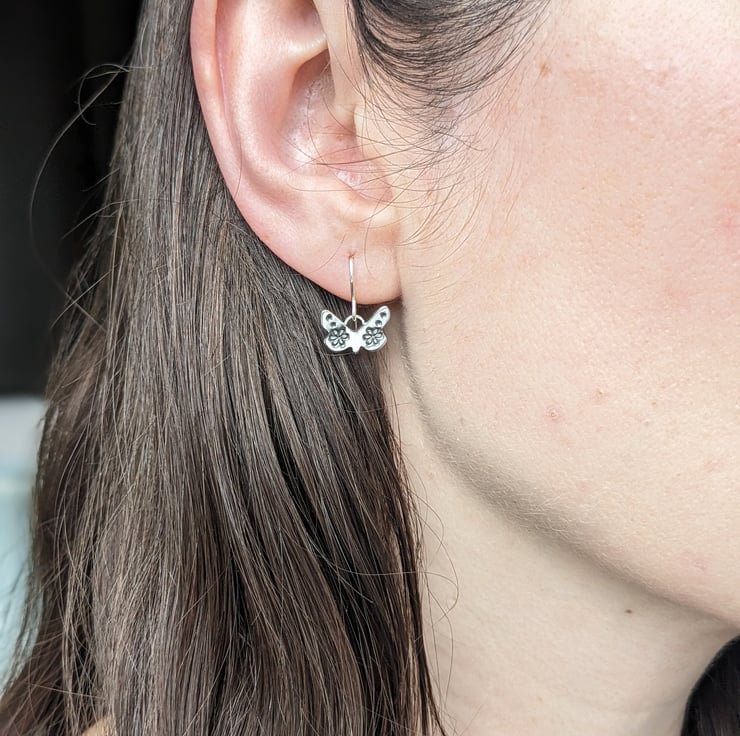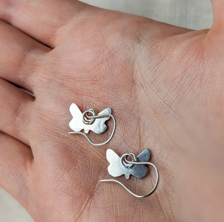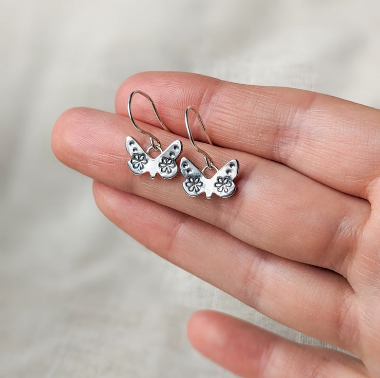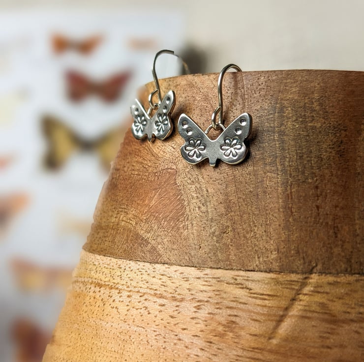 These dainty handmade silver butterfly earrings are hand sawn from recycled silver and hand stamped with the flower designs. They are light and comfortable to wear, and a perfect petite size so they wont catch on longer hair.