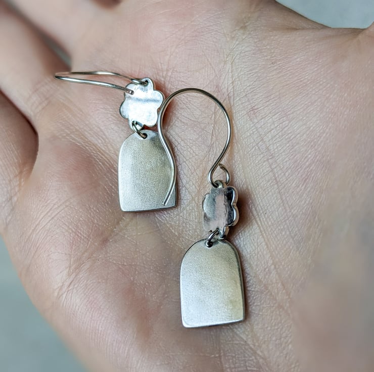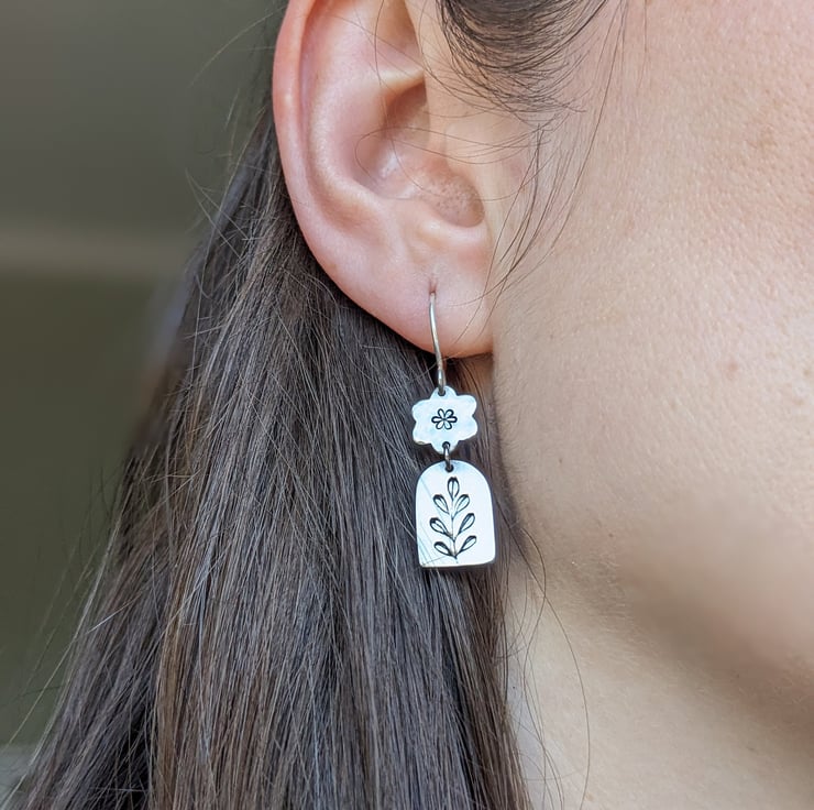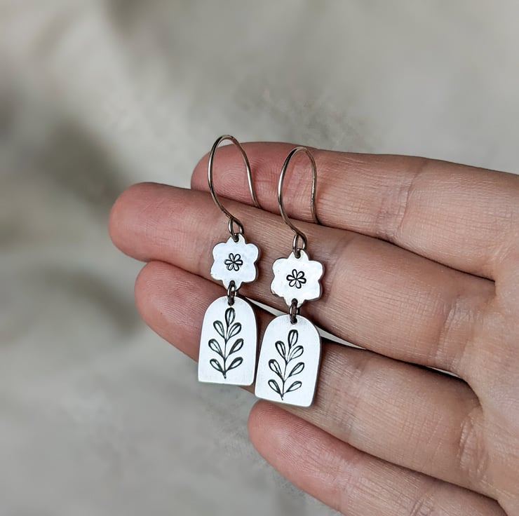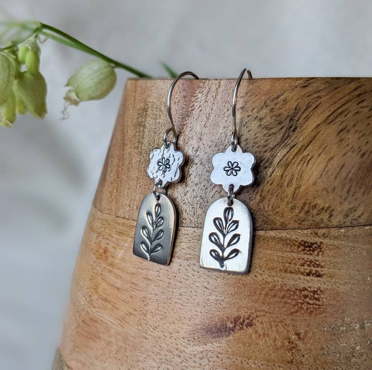 These beautifully pretty sterling silver earrings feature a simple daisy that has been given a hammered texture and then stamped with a daisy motif. Hanging below is a window shaped silver charm stamped with a leaf motif, which has been given a high shine polish.