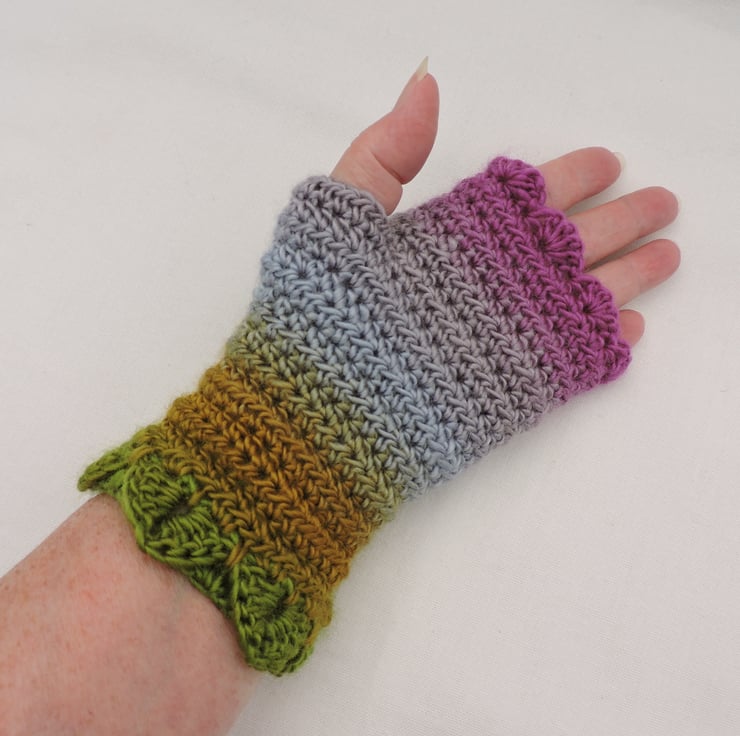Crochet fingerless mittens with dragon scale cuffs made using a double knit self striping acrylic yarn. A single row of dragon scale for the cuffs with a plain body and finished with a wavy edge top. The mitts have graduated colours of green, ochre, aqua, dusky pale mauve and pink. Warm and cosy, ideal for the cold weather