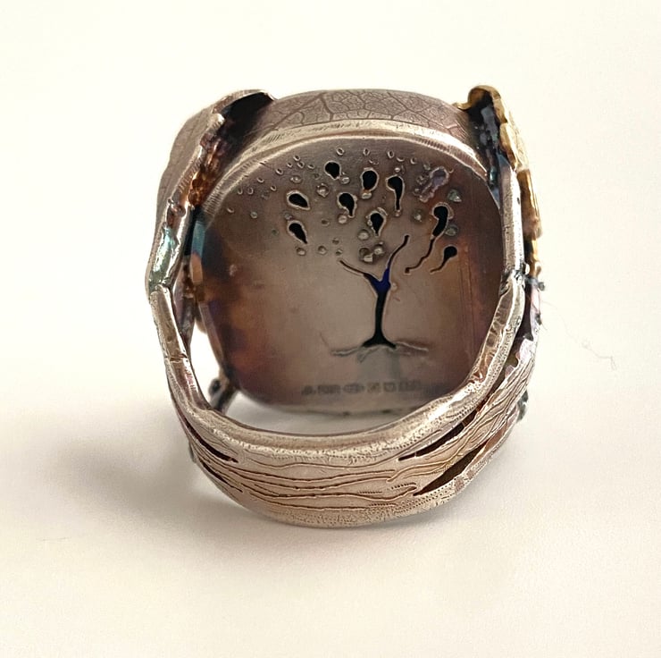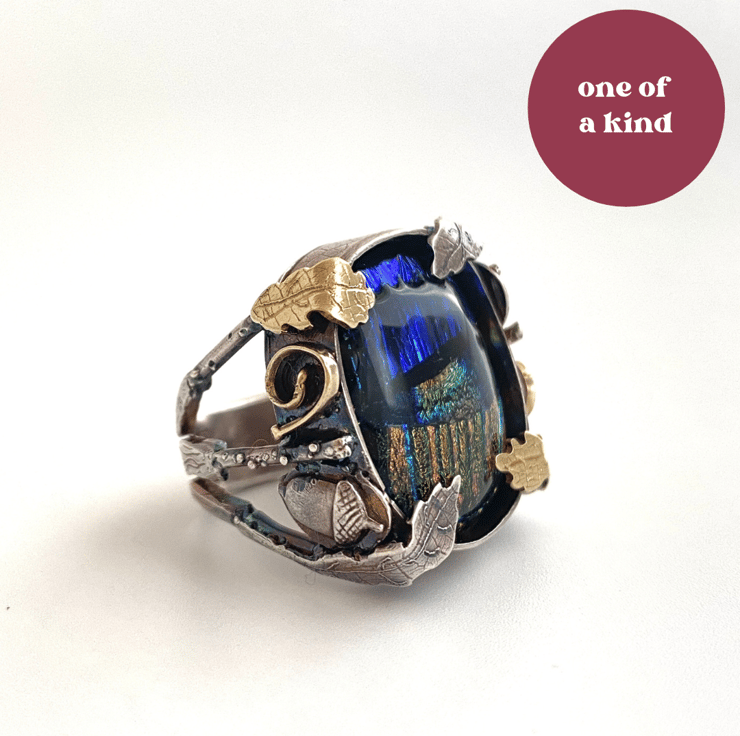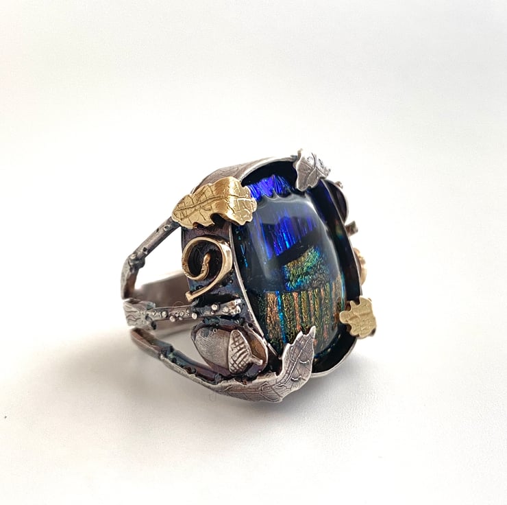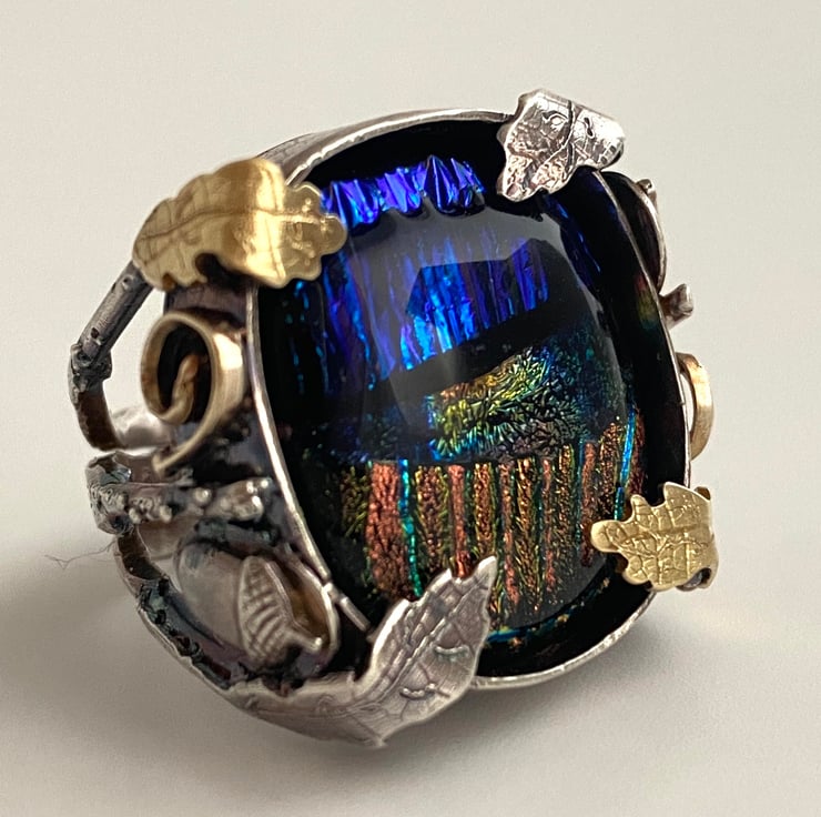 Carefully hand made in my Yorkshire Studio, from solid sterling silver, dichroic glass and 9ct gold oxidised for a darker patina.