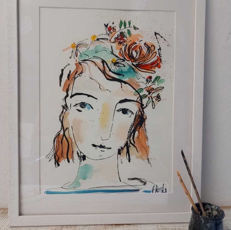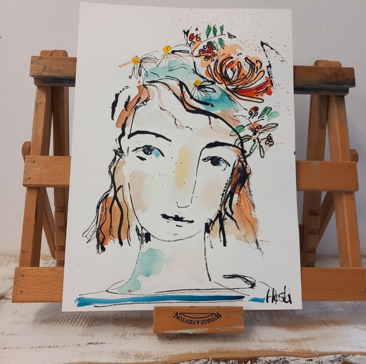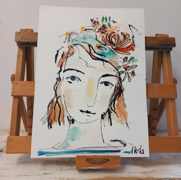 Lotta always wore flowers in her hair. This one off drawing /painting unframed on high quality paper. Made using reels dipped in Indian ink. I can post in tubes or flat between card. Each inky girl is unique, these are originals not prints. More on my Instagram Bodkincreates 28 cm.wide and 36 cm tall unframed.
