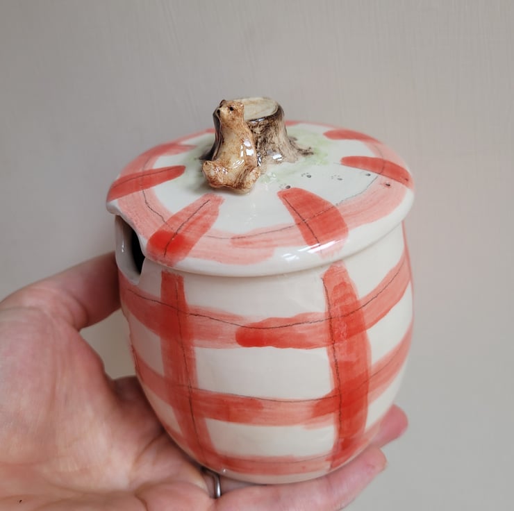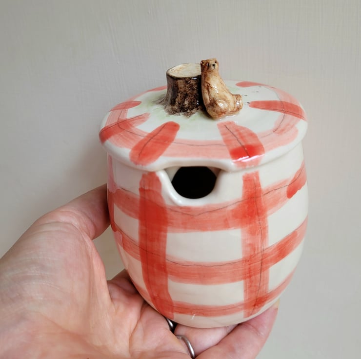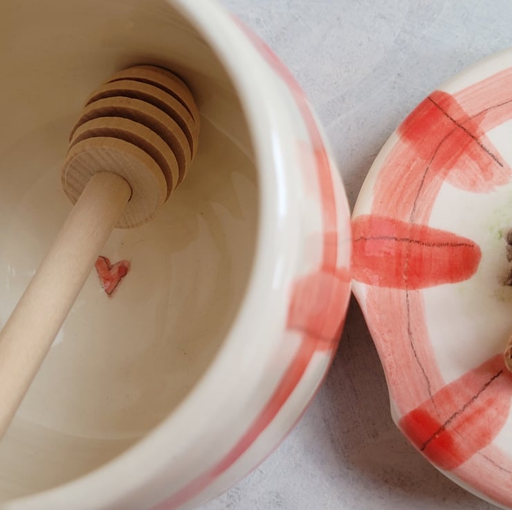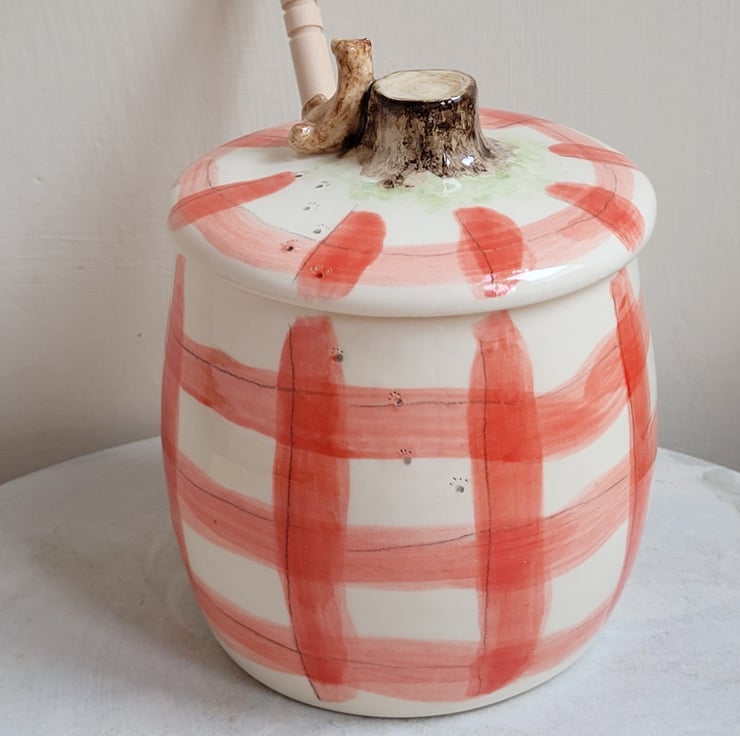 This honey jar was chosen by Folksy fir the summer exhibition : ) MADE To ORDER handmade ceramic honey jar with a little brown bear and red gingham check plus a wooden honey drizzler .
