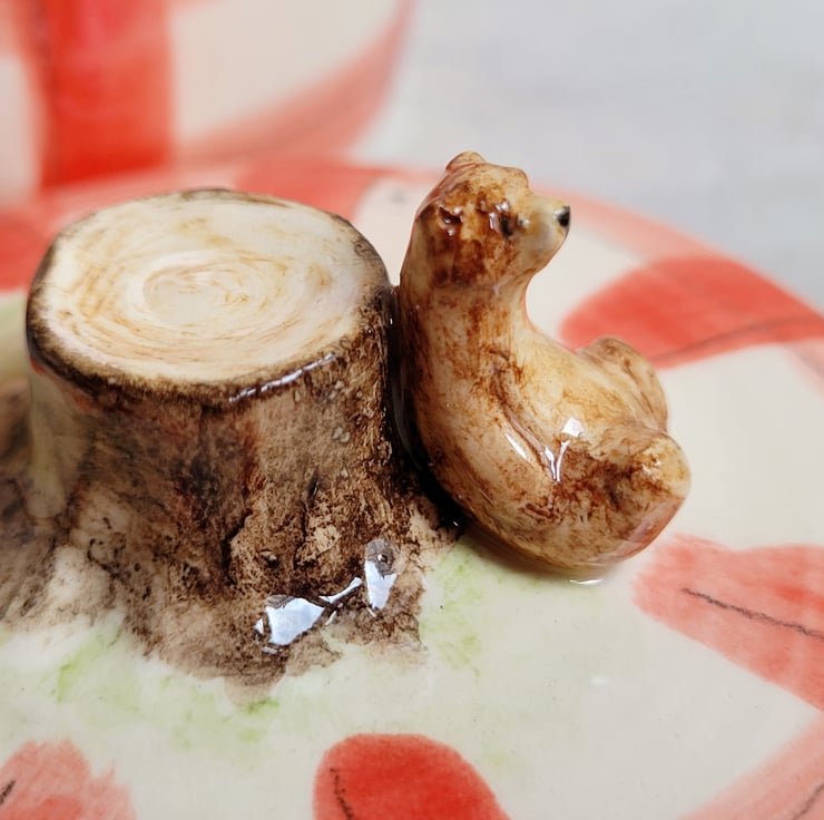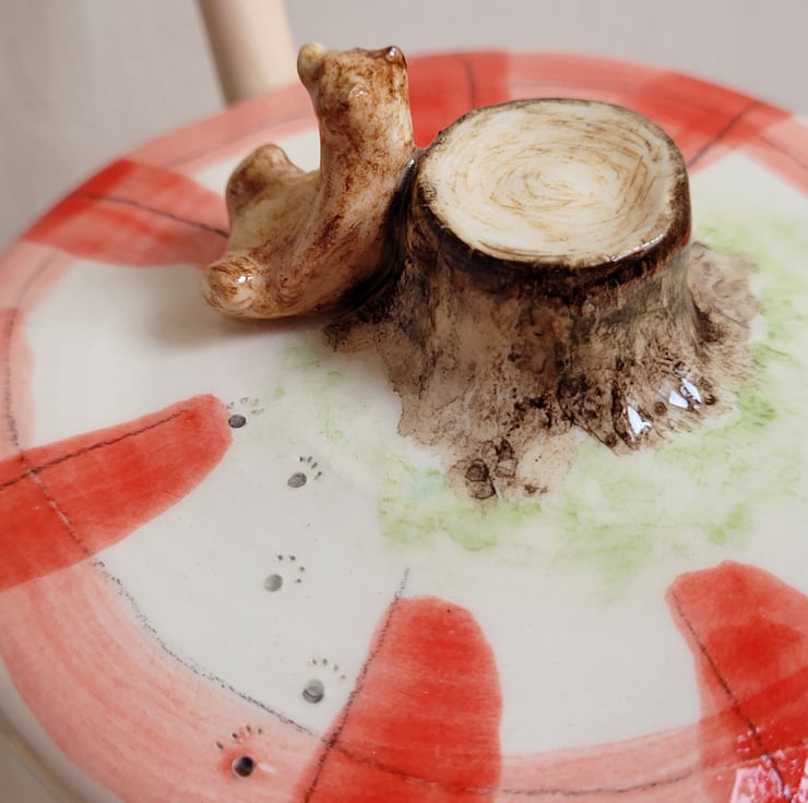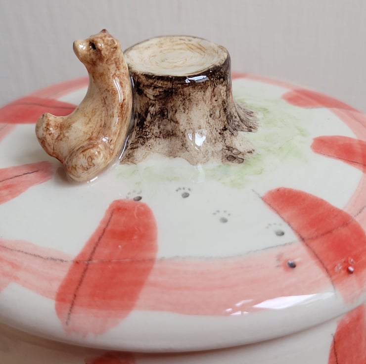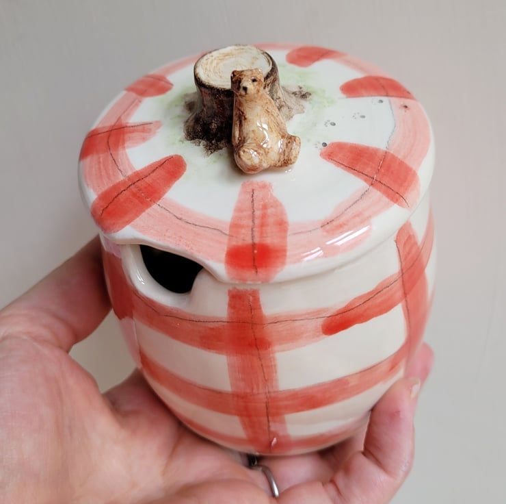 The pieces are hand thrown on my potter's wheel. A little handmodelled whimsical bear and tree stump are added, and tiny paw prints pushed into the clay. Once bisque fired the pieces are hand painted to incorporate a red gingham check and glazed before their final firing.