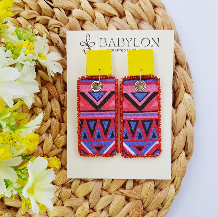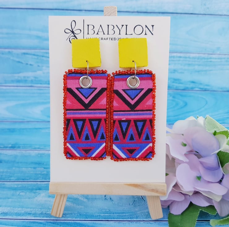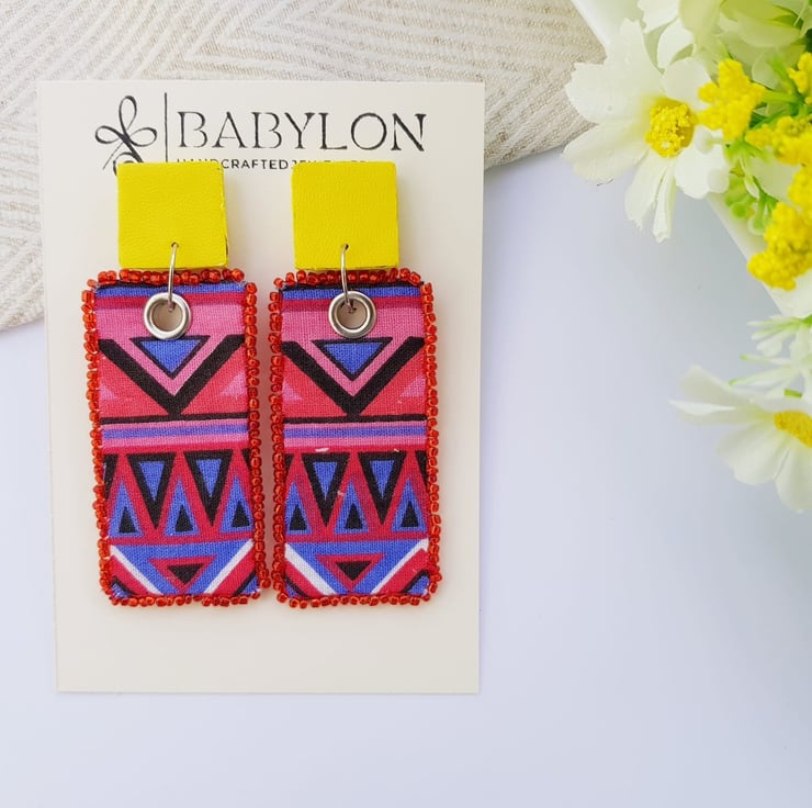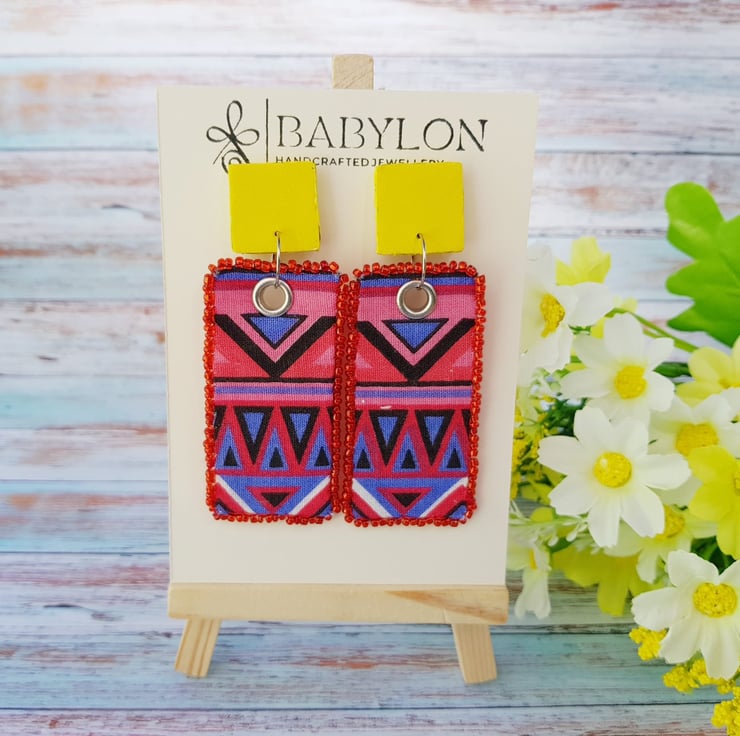 Handmade and rectangular shaped earrings with a tribal-style pattern with red and blue colour made from the finest cotton. The edges of these ethnic earrings are stitched with seed beads mixed with a yellow faux leather.