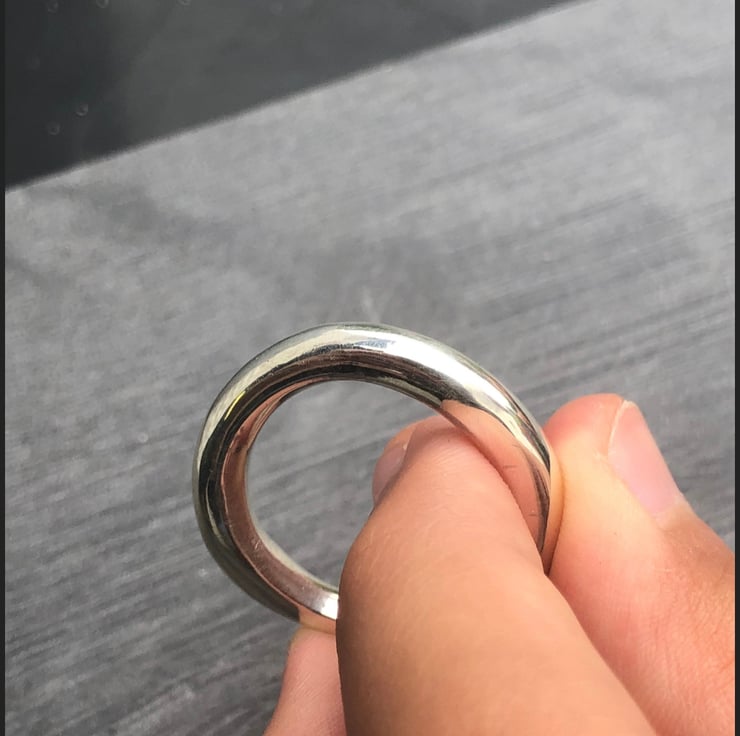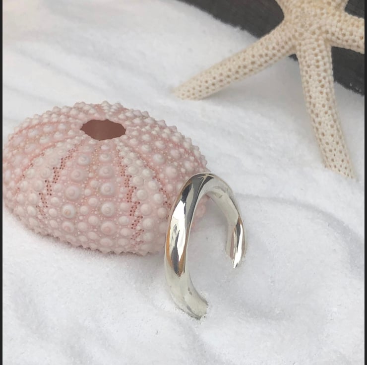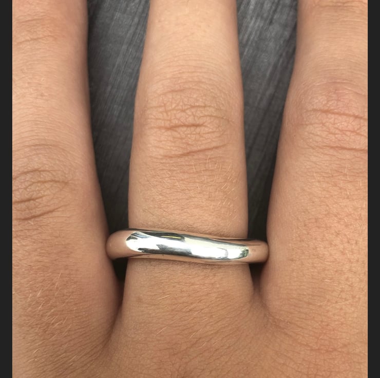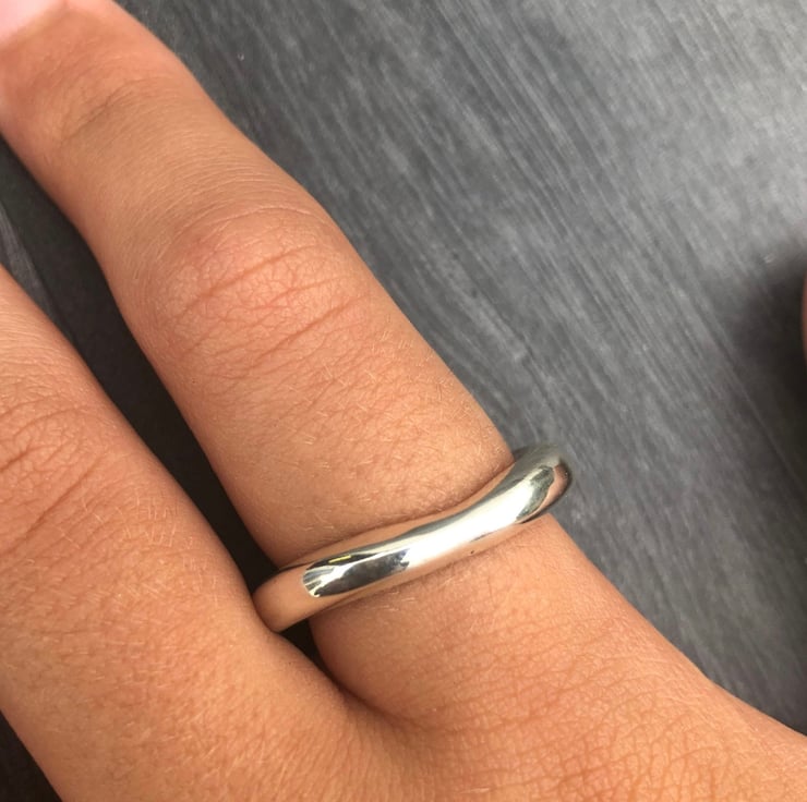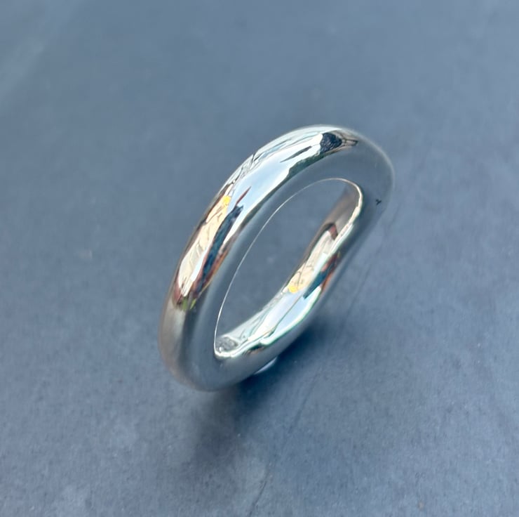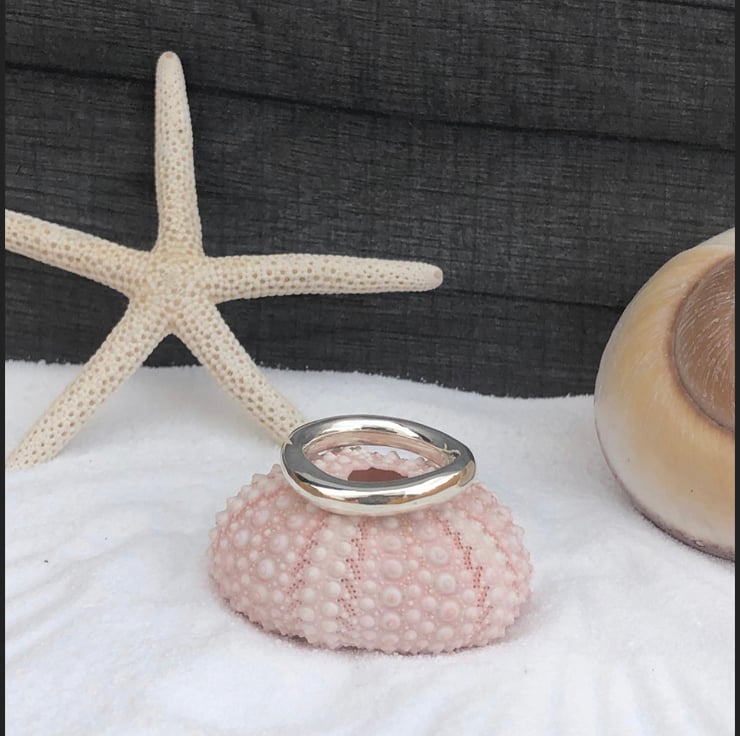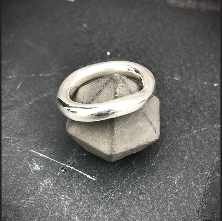 This Chunky Wave Ring is made from Sterling Silver. This freeform ring is a statement piece. The chunky, slightly wavy rounded shank is completely handmade, not cast. The ring measures approx: 5mm in width.
