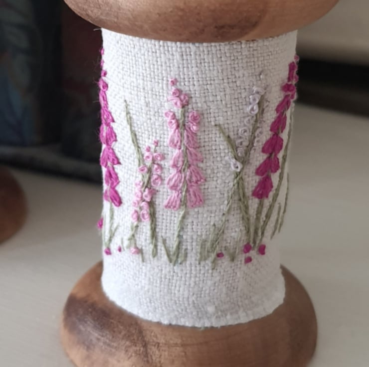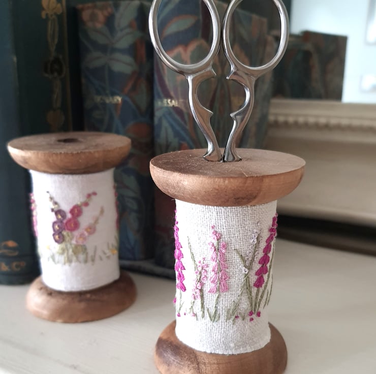 Never lose your scissors when you're sewing again! Pop them into this sweet little wooden bobbin to keep them safe and protect the points. Hand embroidered on vintage linen this is the perfect addition to your workroom or as a gift for a crafty friend!