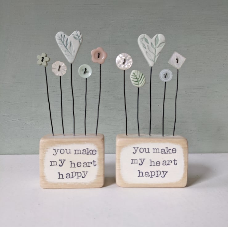 The heart is made from polymer clay. This is hand moulded and patterned, fired and painted to finish. Little button flowers stand alongside it.