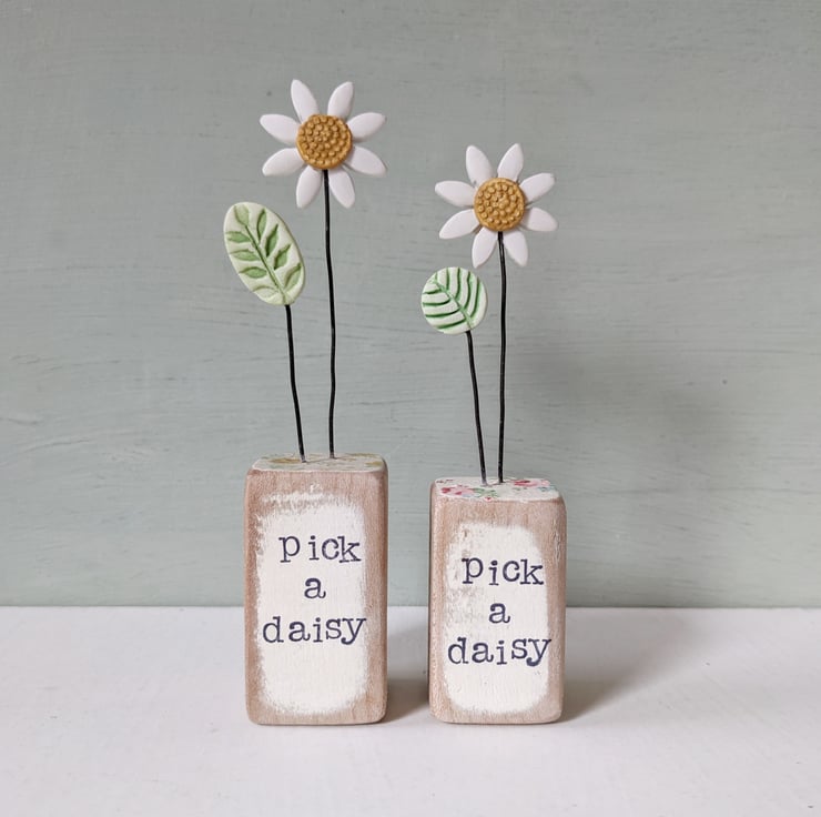 The front of the wooden block is hand stamped with the words 'pick a daisy'.