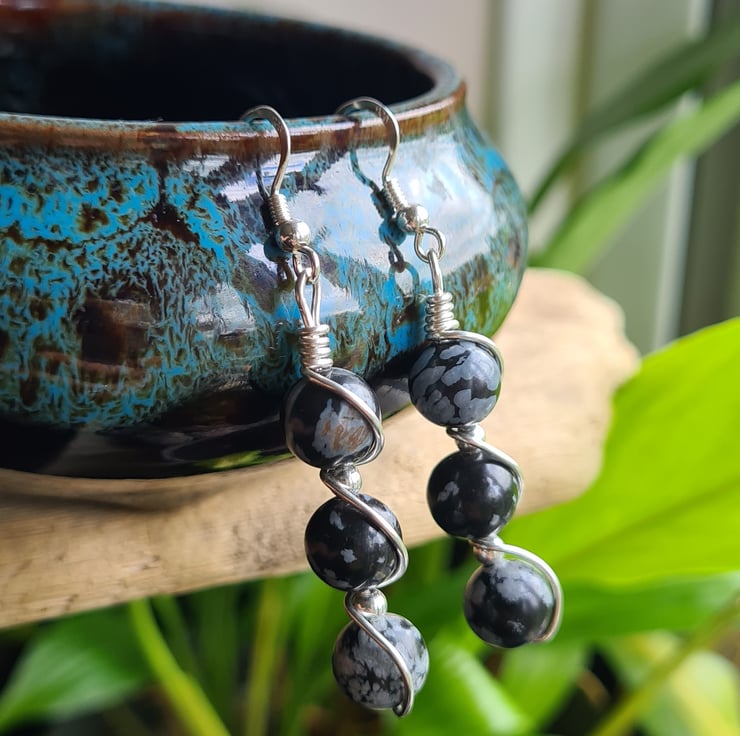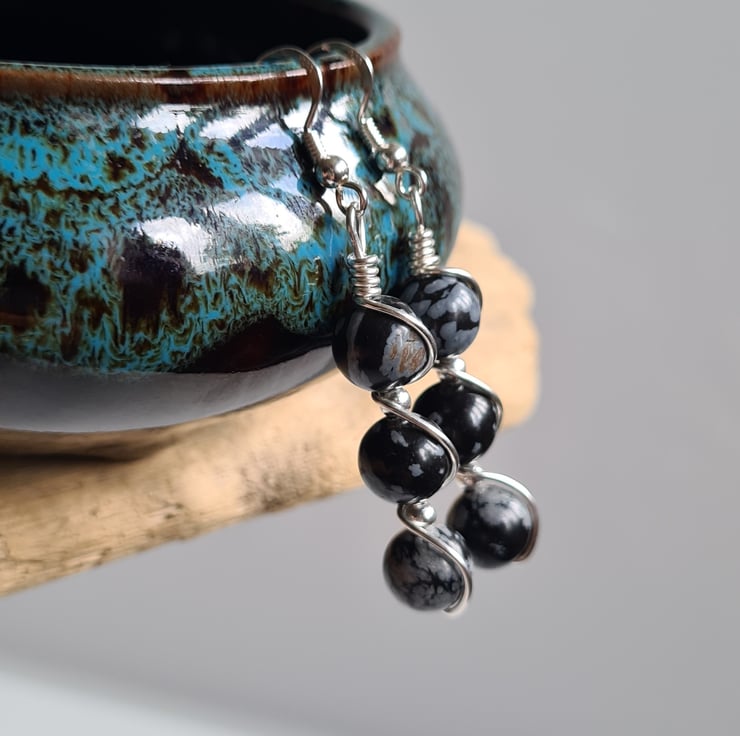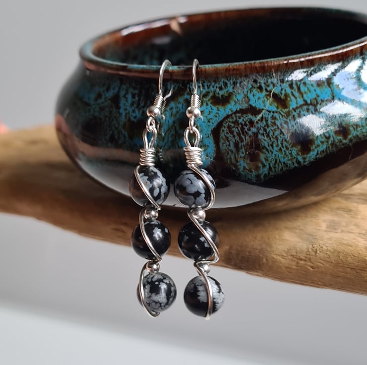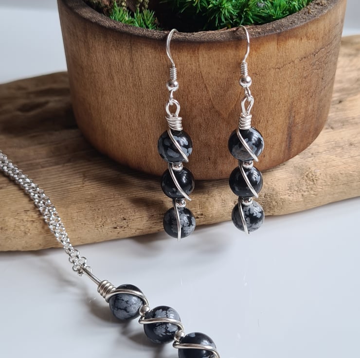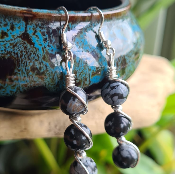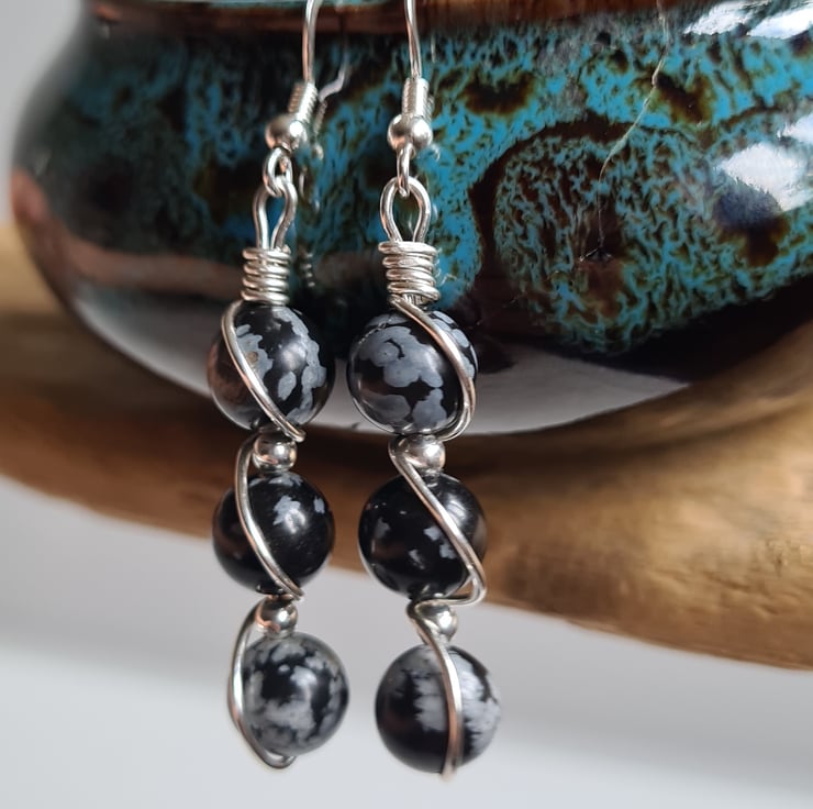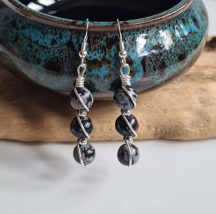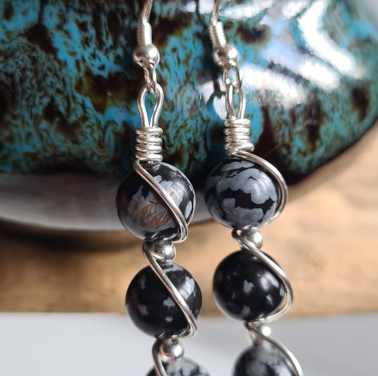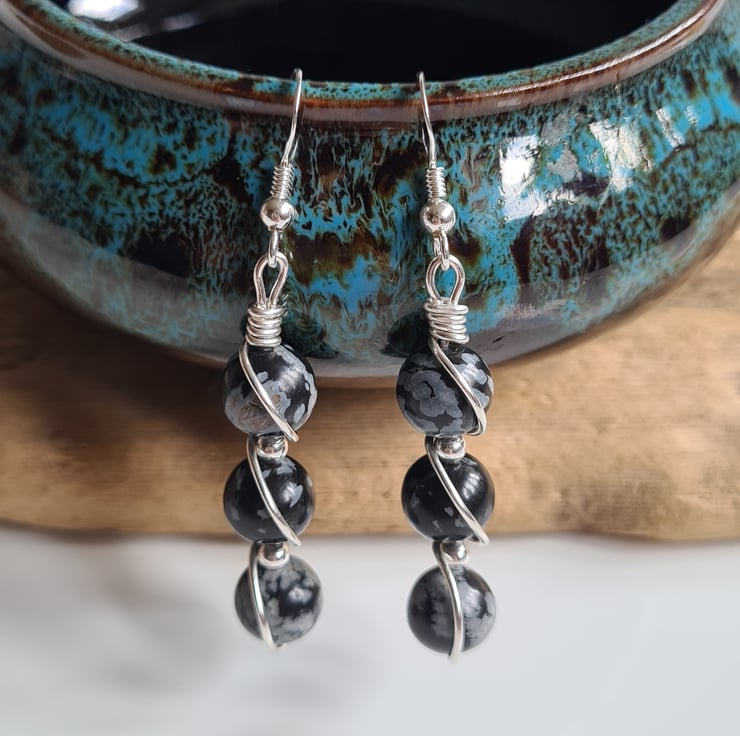 I have wrapped these beautiful Natural Snowflake Obsidian & 925 Silver beads in 925 Silver and the earrings come gift boxed and mounted on 925 silver ear bars. I have a matching pendant for these available, so please check my other listings.