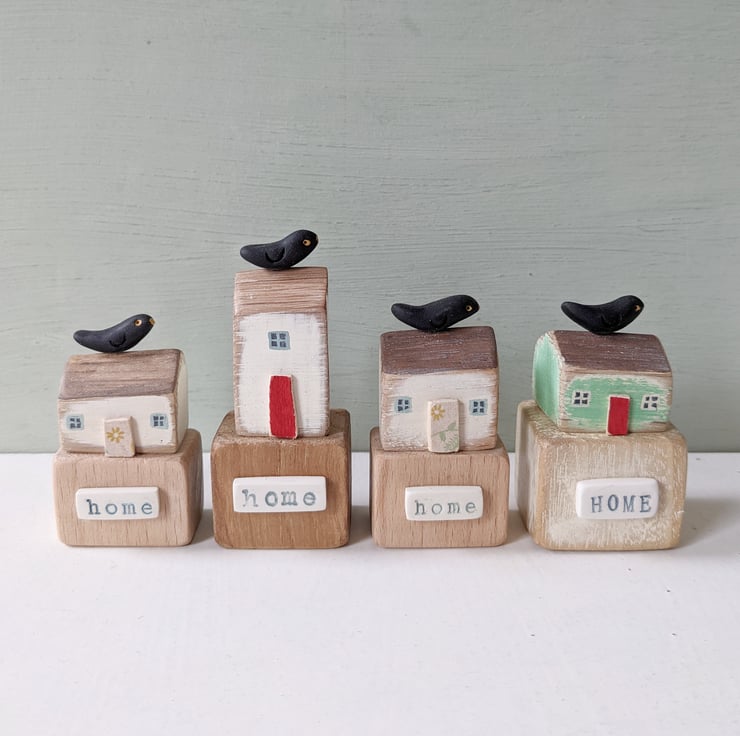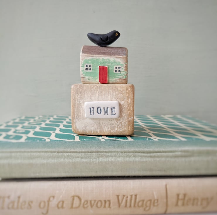 This is one of my tiny little houses, sitting on a lovely wooden block. A jolly bird perches on top!