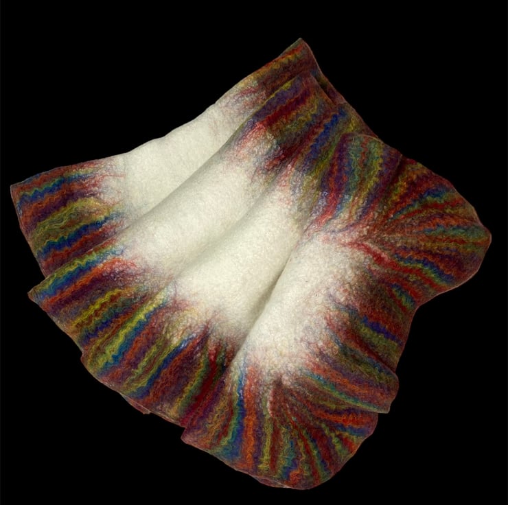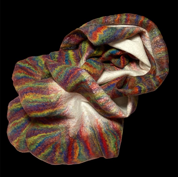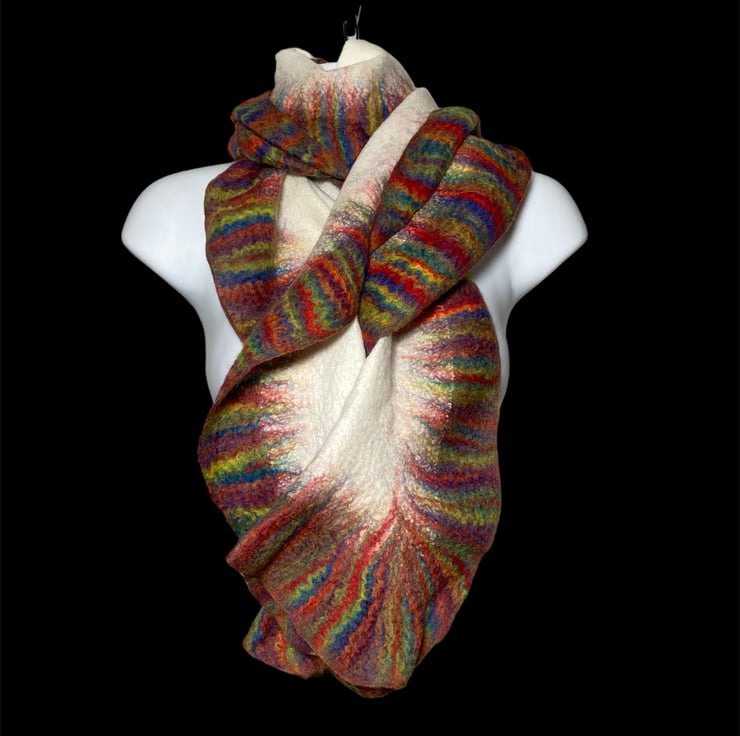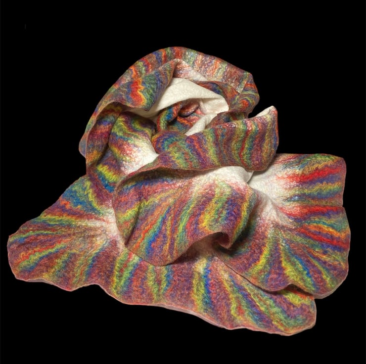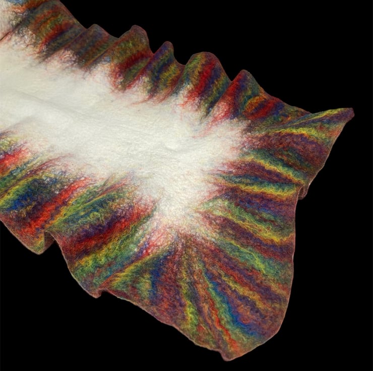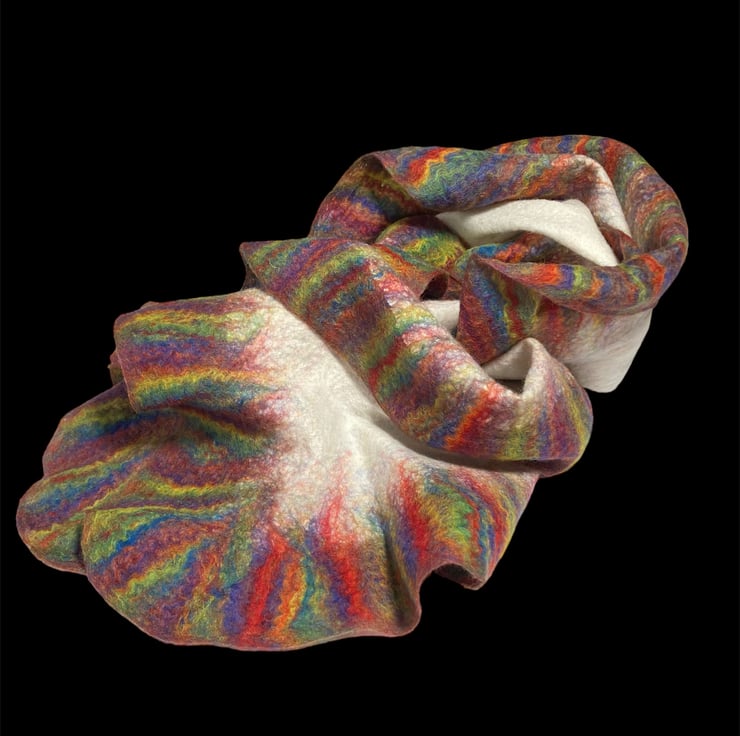 The central white band has been nuno felted, a process whereby a fine layer of woollen fibres is felted to both sides of a piece of silk chiffon. This allows the scarf to remain lightweight whilst the silk chiffon gives strength to the resulting fabric. The rainbow border has been added around the edge and the ruffled effect created by the arrangement of the fibres and their manipulation during the felting process.