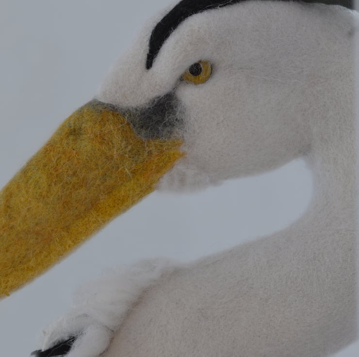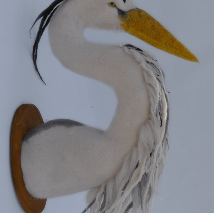 Inspired by an encounter with a Purple Heron, This Grey Heron is Needle felted using Merino, Corriedale and Romney wools. Finished with wet felted Merino and silk bamboo plumage, Glass eyes and a solid wood base.