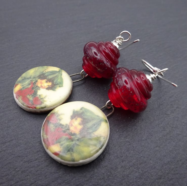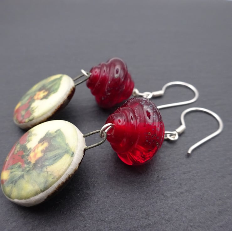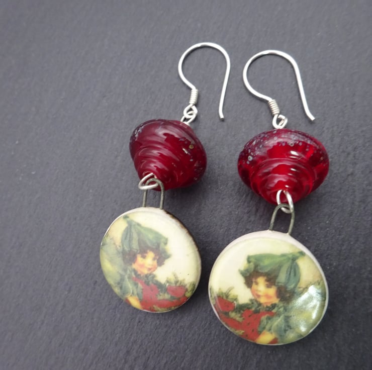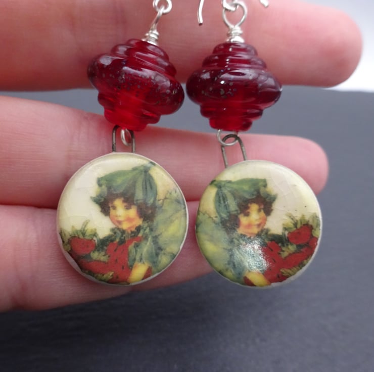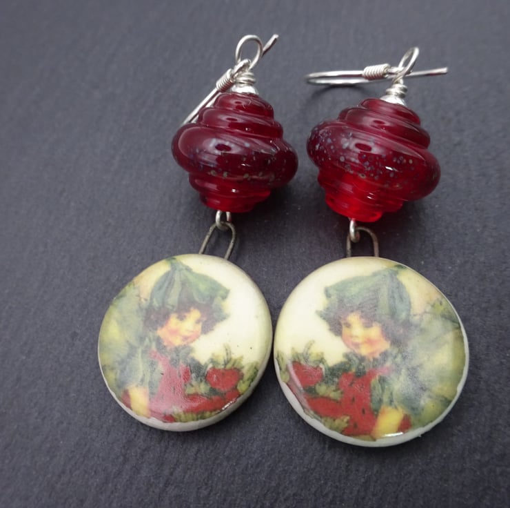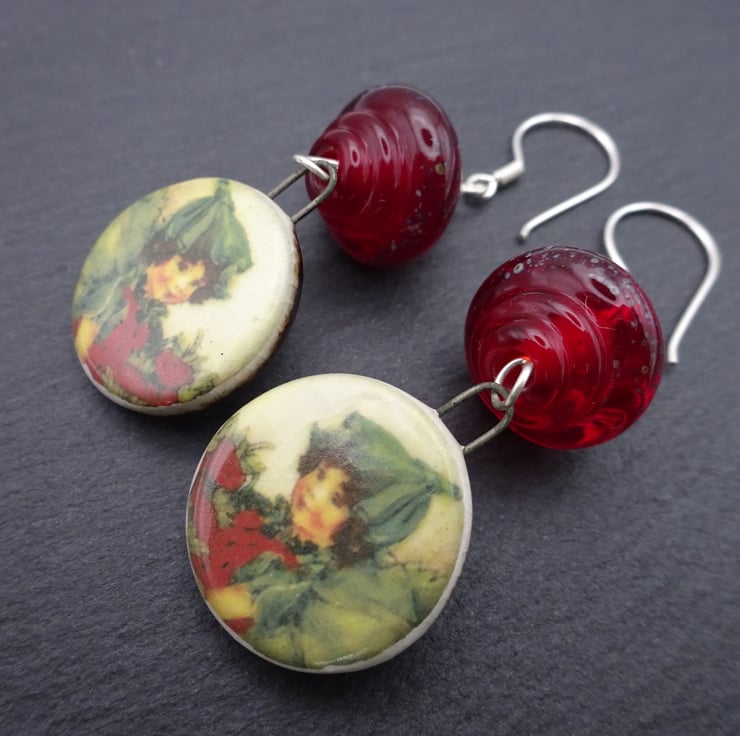 A pair of earrings made with sterling silver ear wires, handmade lampwork red glass beads and handmade ceramic drops which feature an image of the strawberry flower fairy.